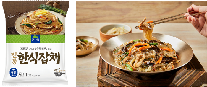 면사랑 냉동팩면 ‘전통 한식잡채’ 리뉴얼 제품(왼쪽), 연출 이미지(오른쪽). 사진제공=면사랑