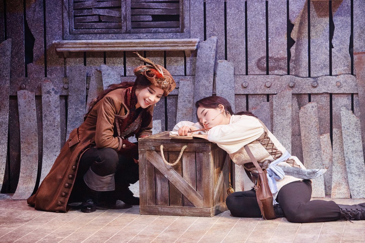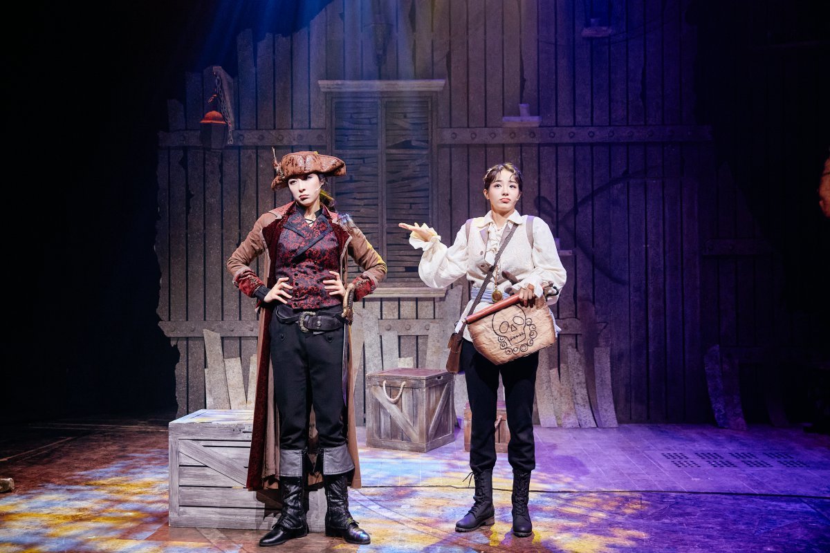 뮤지컬 ‘해적’에서 잭(정우연·왼쪽)과 루이스(임예진)는 바다에서 거친 시간을 보내며 점점 가까워진다. 콘텐츠플래닝 제공임찬민은 잭이 항해에 데려가지 않으려하자 보물섬 지도를 외운 후 먹어치우는 당찬 루이스를 깜찍하게 연기한다. 사생아라는 이유로 받아온 모멸감을 세상에 돌려주겠다며 분노에 찬 앤도 서늘하게 소화한다. 랑연은 거칠어 보이지만 빈틈 많고 속정 깊은 잭, 냉철하고 두려움을 모르는 메리로 자유자재로 변신한다. 이들은 터질 듯한 고음도 시원하게 내지르며 열기를 뿜어낸다.