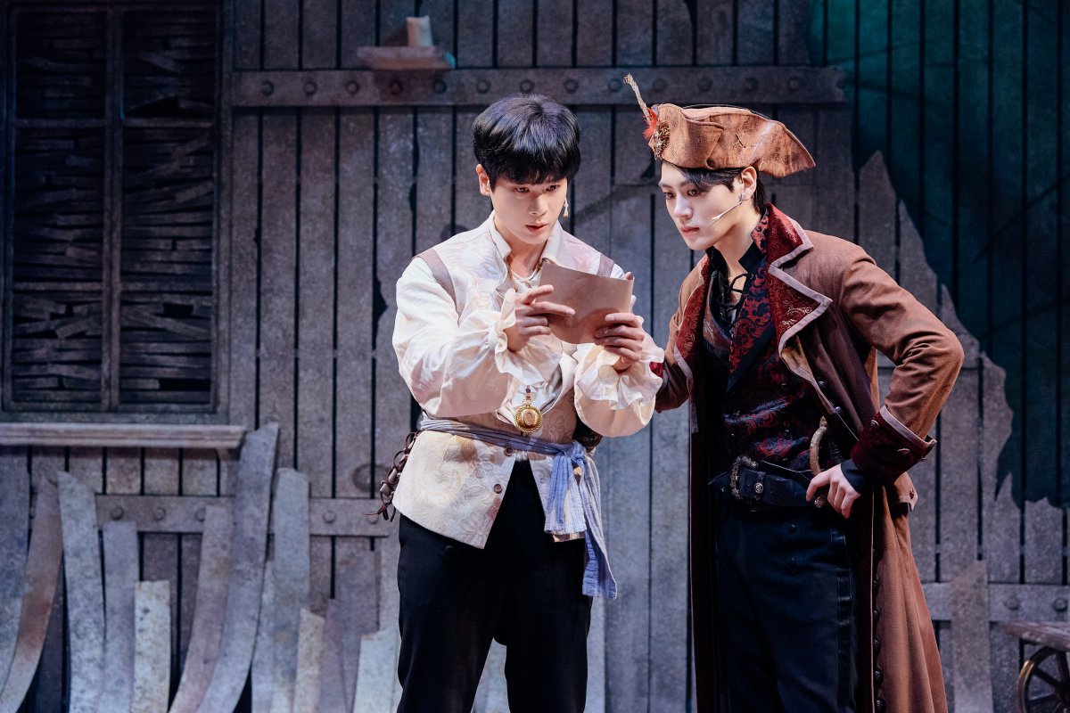 뮤지컬 해적에서 루이스(박규원·왼쪽)와 잭(김지온)은 티격태격하며 정을 쌓아간다. 콘텐츠플래닝 제공일확천금을 꿈꾸며 바다로 나아가던 18세기 초. 해적이었던 아버지가 세상을 떠난 후 홀로 지내는 17살 루이스 앞에 아버지의 친구라고 주장하는 해적 캡틴 잭이 나타난다. 루이스가 틈틈이 보던 아버지의 항해 일지에서 발견한 장미와 해골 표식 그림이 실은 보물섬 지도라고 한다. 루이스는 잭과 함께 보물섬을 찾아 나선다.