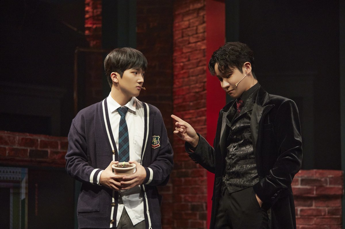 뮤지컬 ‘클로버’에서 정인(최민영·왼쪽)과 지상에 내려온 악마 헬렐(강찬)이 이야기를 나누고 있다. 글림아티스트 글림컴퍼니 제공