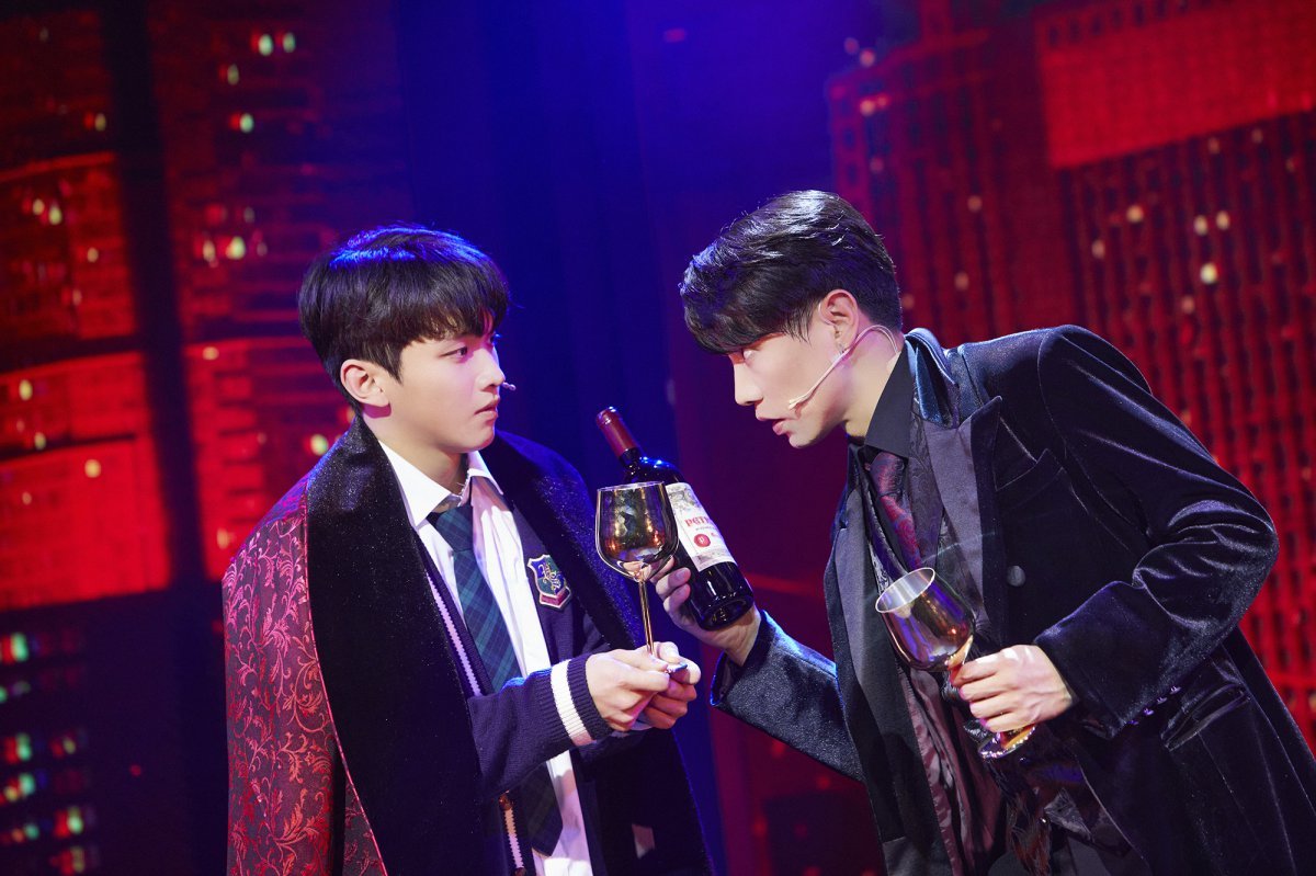 뮤지컬 ‘클로버’에서 헬렐(고상호·오른쪽)이 정인(홍성원)에게 와인을 건네며 유혹하고 있다. 글림아티스트 글림컴퍼니 제공