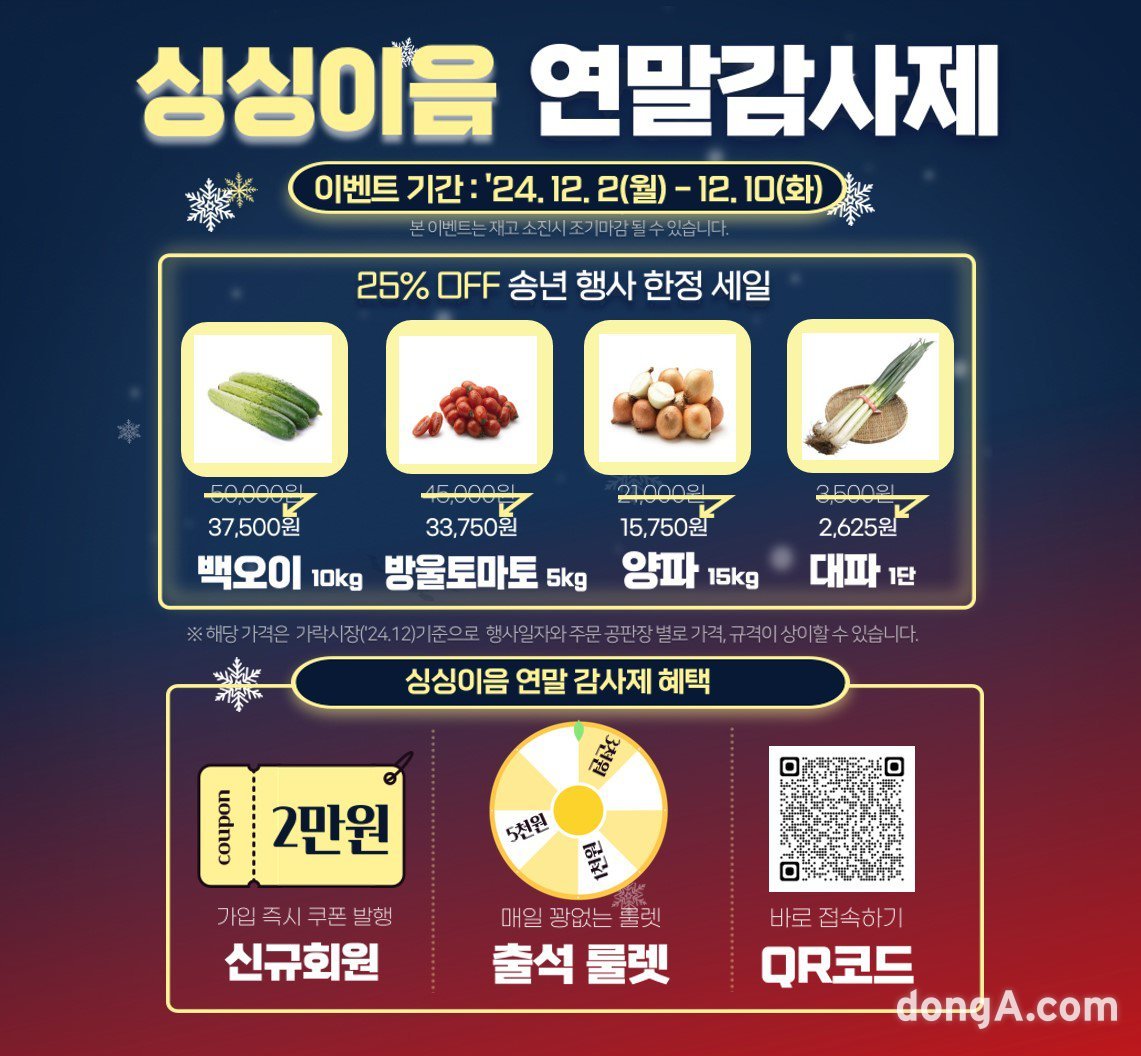 이번 기획전은 연말을 맞아 고객들의 꾸준한 관심에 보답하는 의미로 마련됐다. 인기품목인 ▲백오이 ▲방울토마토 ▲양파 ▲대파를 25% 할인 판매한다.