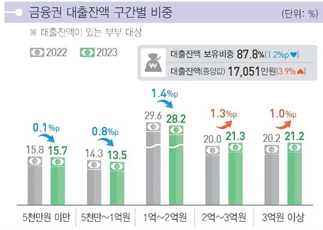 주택을 소유한 부부의 대출잔액 중앙값은 2억707만 원으로, 무주택 부부(1억4472만 원)보다 약 1.4배 많았다.