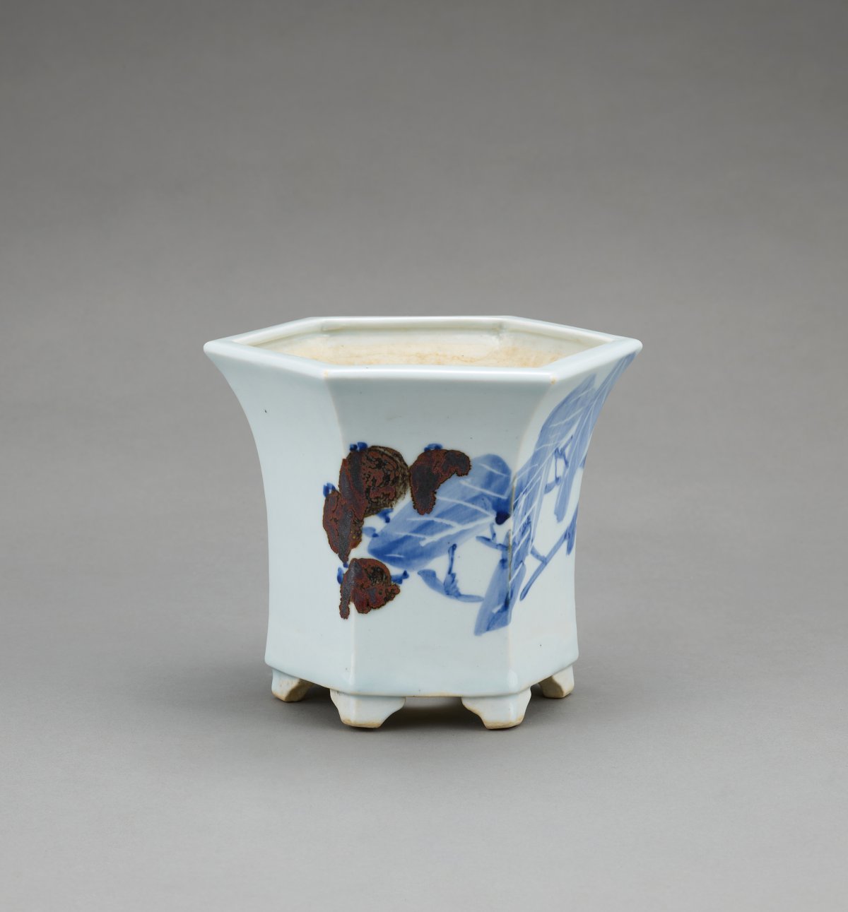 안동오가 만들고 장우성이 그린 ‘백자청화시비파문육각화분’. 국립현대미술관 제공1부 전시장에서 만날 수 있는 ‘도화’ 시리즈는 도예가 안동오(1919~1989)가 만든 백자 위에 장우성(1912~2005), 서세옥(1919~2020), 김기창(1913~2001) 등 유명 한국 화가들이 청색 물감으로 그렸다. 김기창이 그린 ‘백자청화기우’에는 소년을 태운 소가 힘차게 걸어가는 모습이, 장우성이 그린 ‘백자청화시비파문육각화분’에는 전통적 문인화 소재인 비파나무가 묘사됐다.