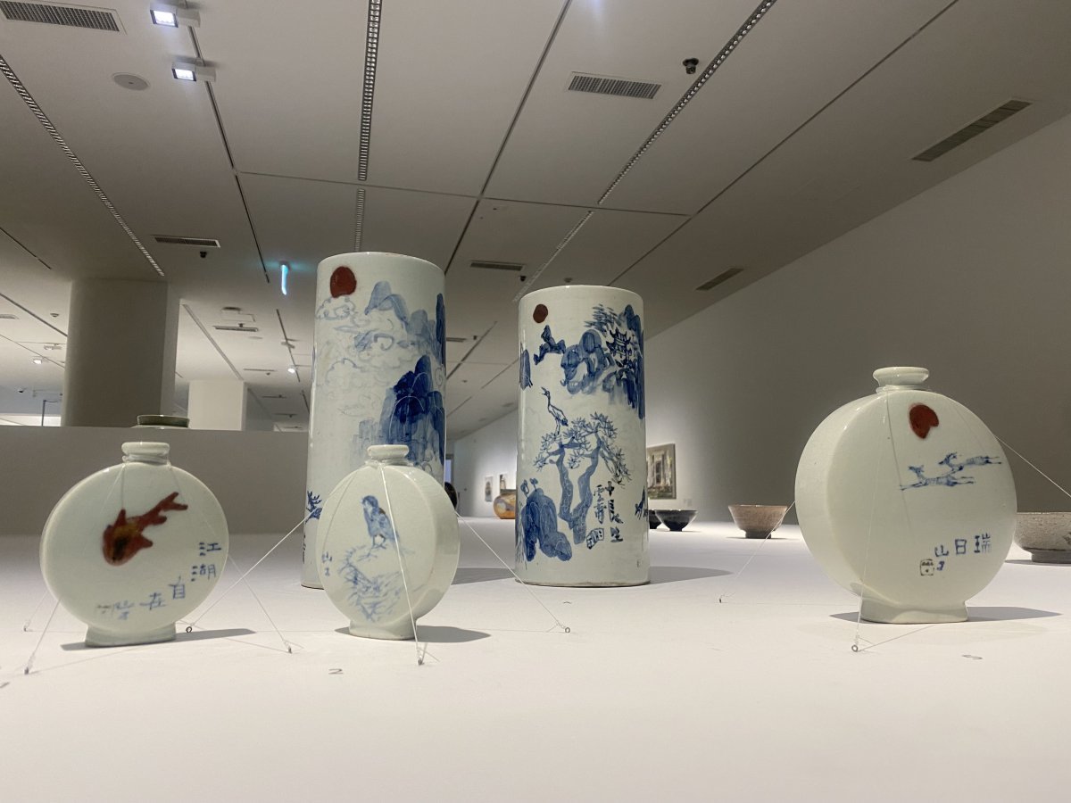 왼쪽 서세옥이 그림 그리고 안동오가 만든 ‘백자청화시물고기문편병’이 보인다. 이 작품들은 이건희 컬렉션의 ‘도화 시리즈’ 다. 사진 뉴시스