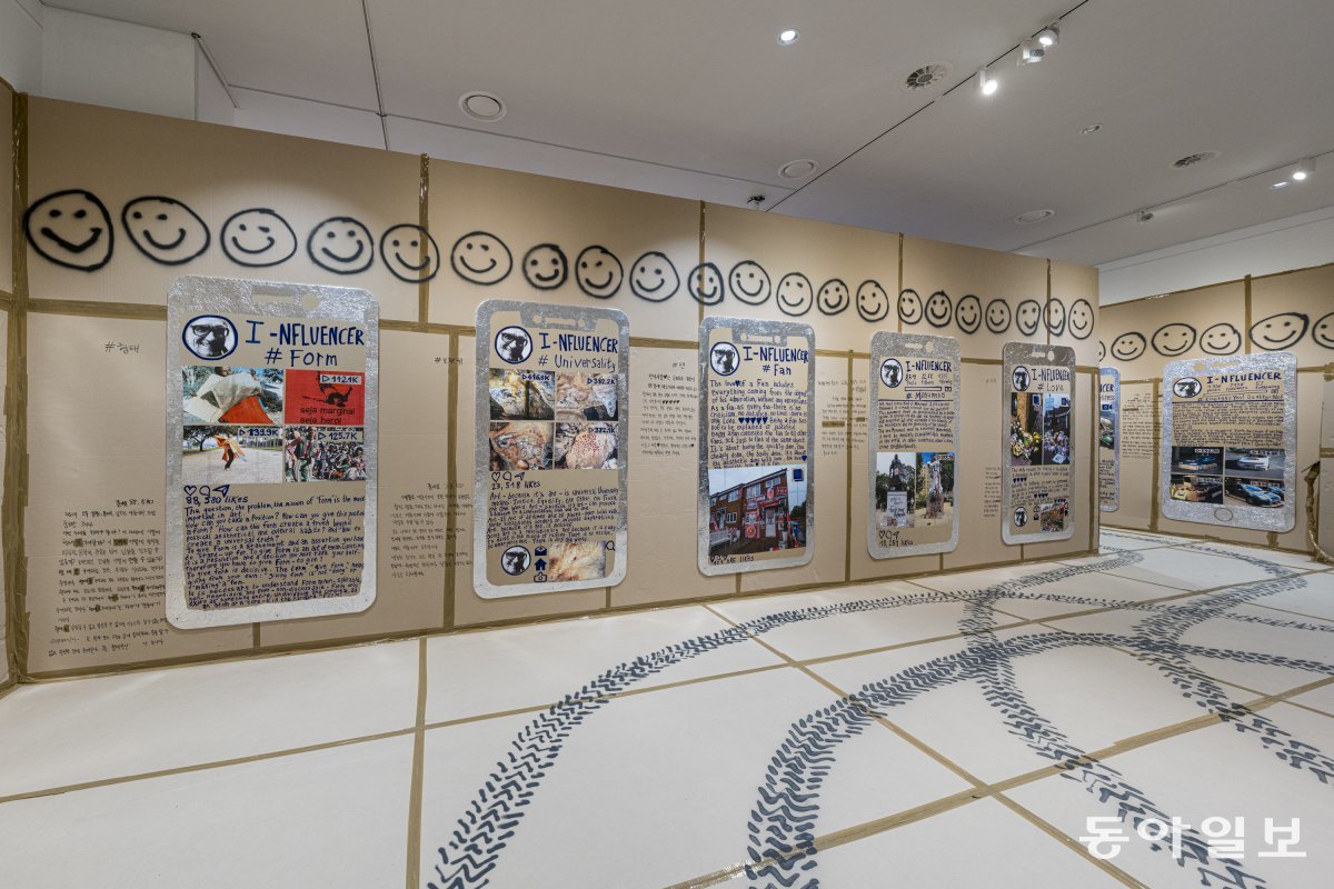 소셜 미디어 화면을 종이와 손글씨를 재구성한 토머스 허쉬혼의 설치 작품이 ‘능수능란한 관종’전에 전시된 모습. 부산현대미술관 제공부산=김민 기자 kimmin@donga.com