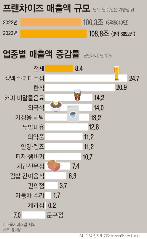 지난해 프랜차이즈 가맹점 매출액이 108조를 넘어서면서 역대 최대를 기록했다. 편의점이 매출액의 4분의 1로 가장 큰 비중을 차지했고, 생맥주·기타주점에서 매출 증가율이 가장 높았다.