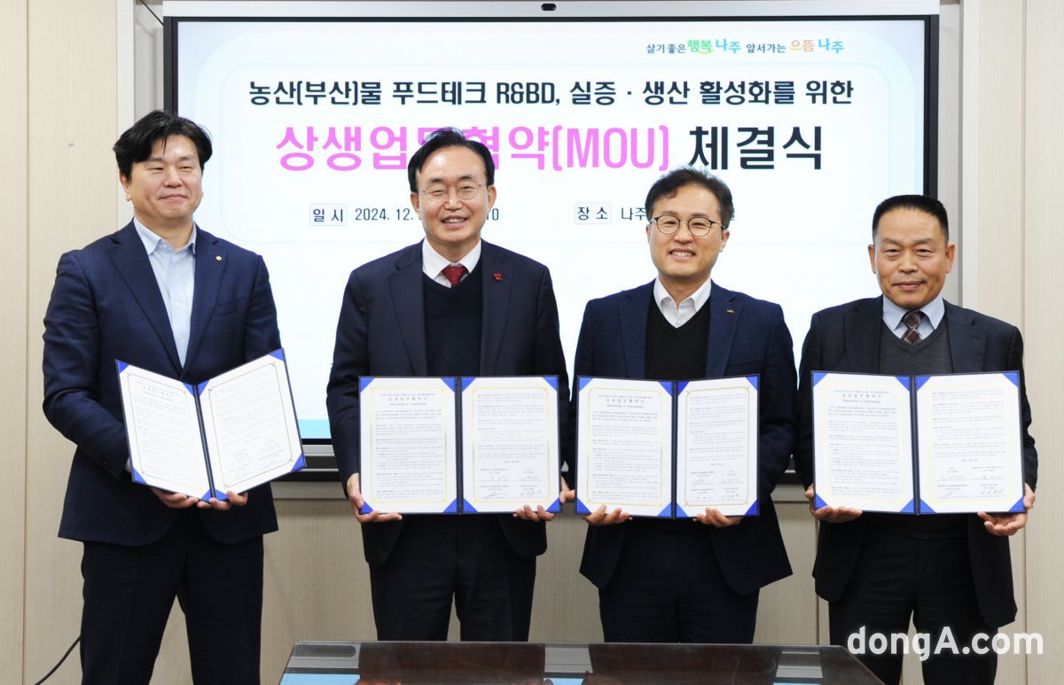 농협경제지주 농협식품R&D연구소가 26일 나주시청에서 나주시, 전라남도농업기술원, 광동제약과 ‘농산물·농산부산물 푸드테크 R&BD, 실증·생산 및 지역산업 활성화를 위한 업무협약’을 체결했다.