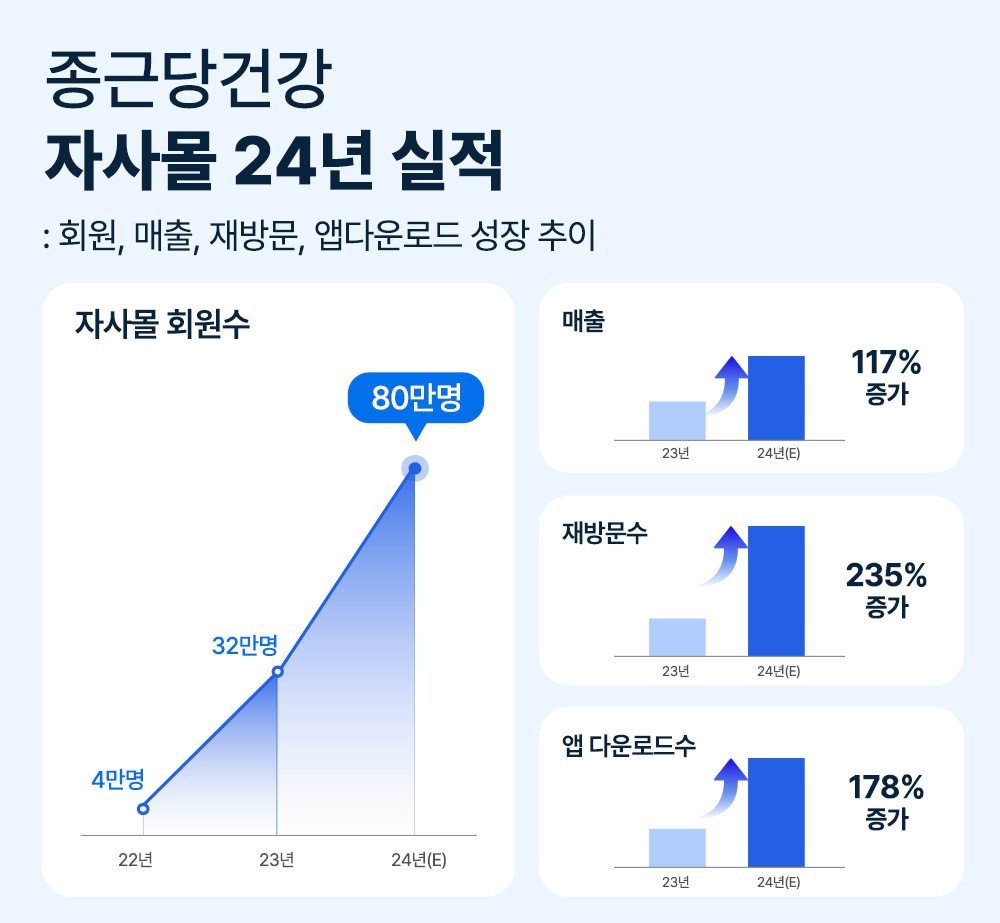 종근당건강에 따르면 지난 2023년 자사몰을 새롭게 단장한 후 2년 동안 회원 수가 80만 명을 돌파했고 자사몰 매출은 117% 증가했다. 재방문수는 235% 늘어나 자사물 이용 빈도가 꾸준한 것으로 나타나기도 했다. 모바일 앱 다운로드 수는 178% 늘었다.