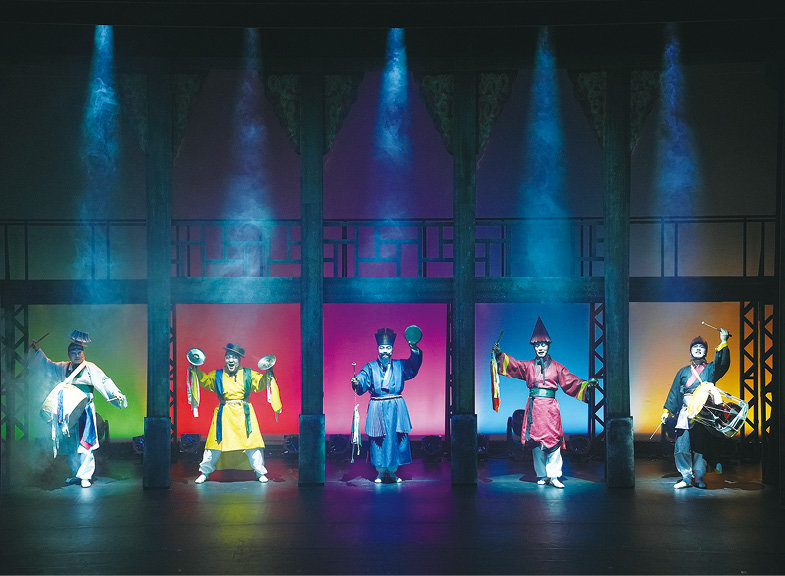 국립정동극장이 선보이는 전통연희극 ‘광대’ 공연 모습. 국립정동극장 제공작품은 ‘2025 소춘대유희’ 공연을 준비하던 예술단원들 앞에 갑자기 100년간 공연장을 지키며 살아온 백년광대와 오방신(극장신)이 나타나며 신명과 유희, 광대 정신을 나누는 이야기를 그린다. 100년 전의 광대들과 지금의 예인들이 만나 궁중정재, 민속춤, 판소리, 풍물, 버나 등 다양한 전통연희를 펼쳐낸다.