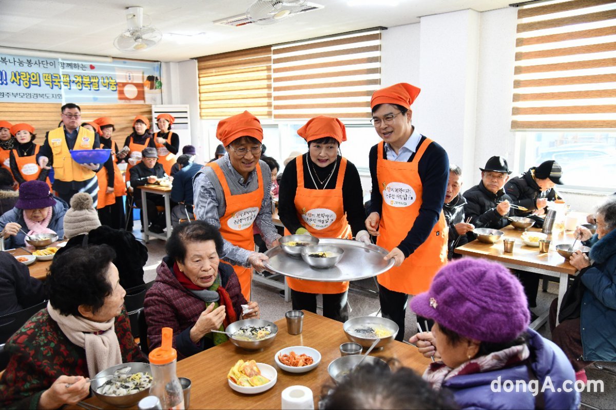 최진수 경북농협 본부장이 3일 대한적십자사 안동나눔터를 찾아 준비한 떡국 170인분으로 지역 어르신들에게 오찬을 대접하고 있다. 사진 가운데 오른쪽부터 최진수 경북농협 본부장, 강정미 고향주부모임 경북도지회장, 김주원 NH농협은행 경북본부장. 농협 제공최진수 경북농협 신임 본부장이 농업·농촌 현장점검과 지역사회 봉사활동으로 취임식을 대신하며 본격적인 현장 소통행보에 나섰다.