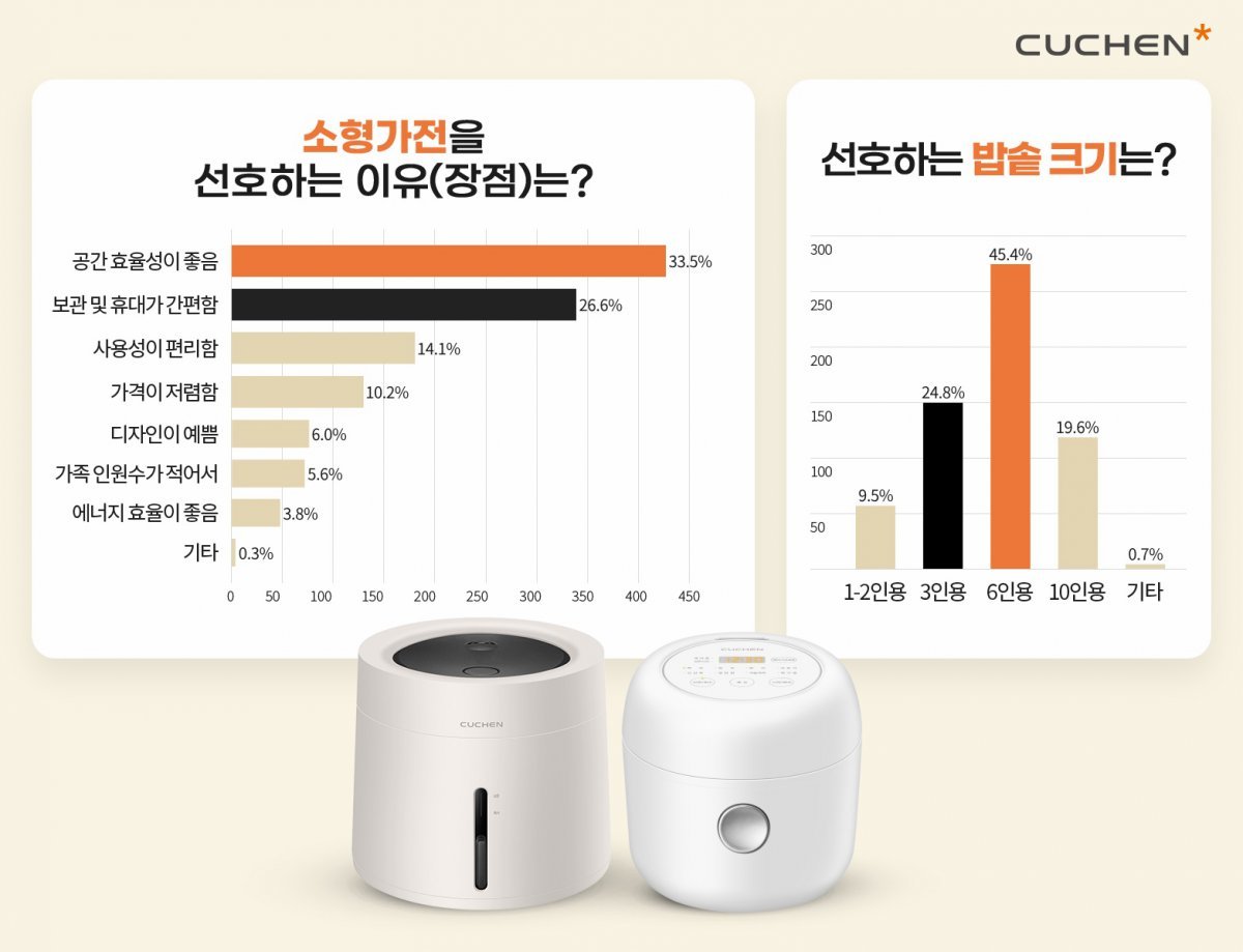 7일 주방가전기업 쿠첸이 2060세대 소비자 618명을 대상으로 실시한 ‘소형가전·소형밥솥 선호도 및 보유 현황’ 설문조사에 따르면 응답자의 77.2%가 소형가전을 선호한다고 답했다.