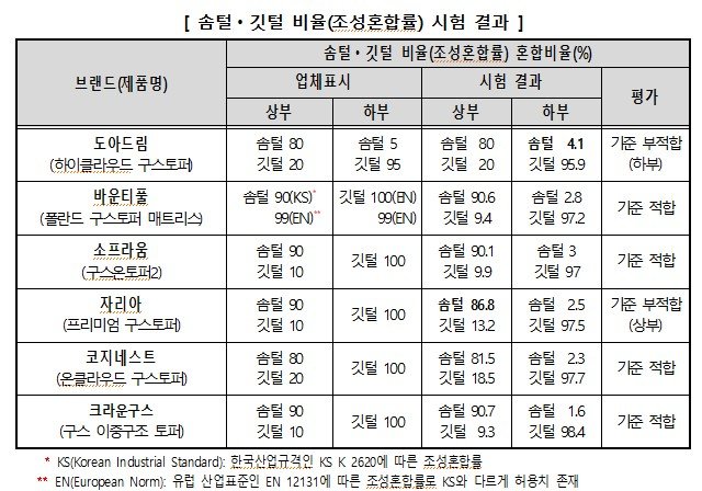 도아드림(하이클라우드 구스토퍼)와 자리아(프리미엄 구스토퍼) 제품은 솜털 비율이 제품에 표시된 수치보다 낮게 나타났다.
