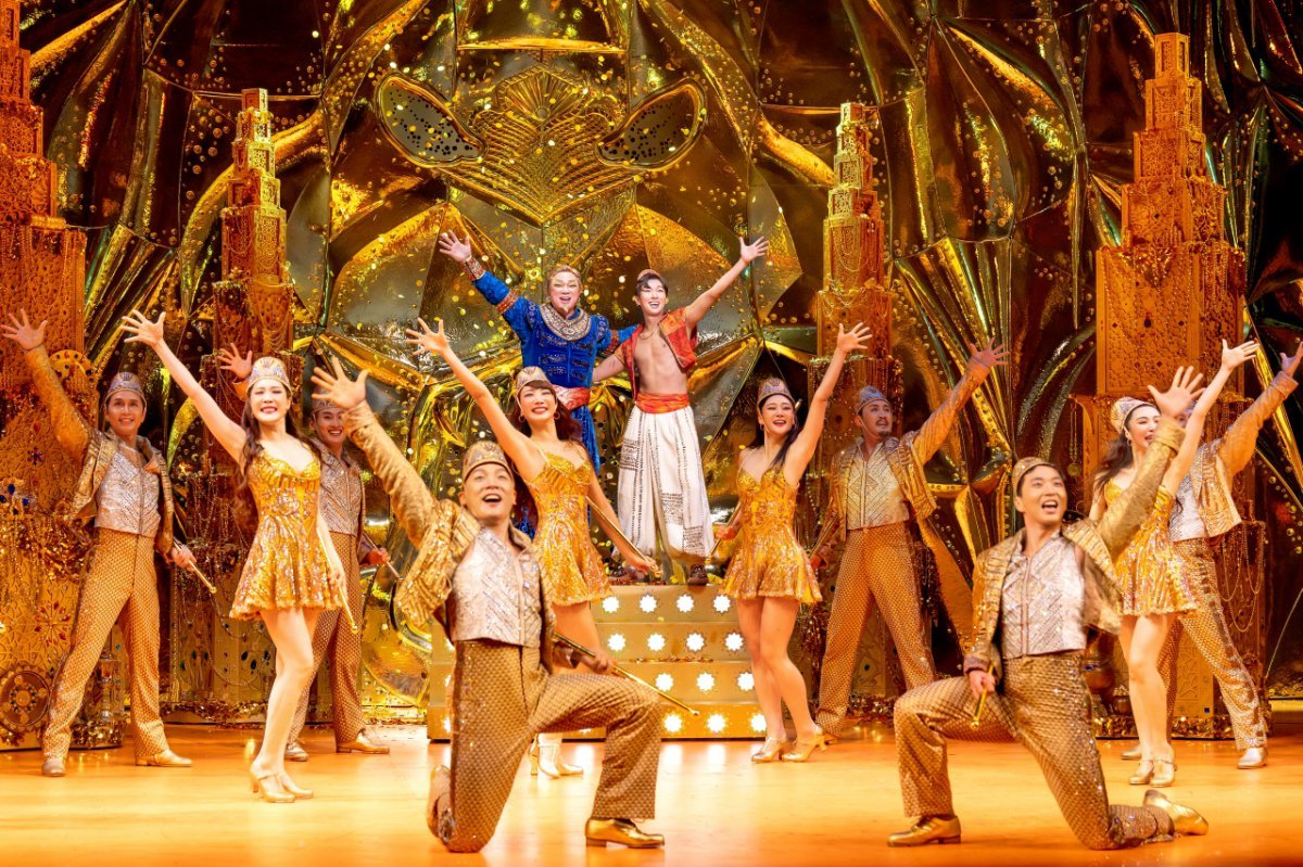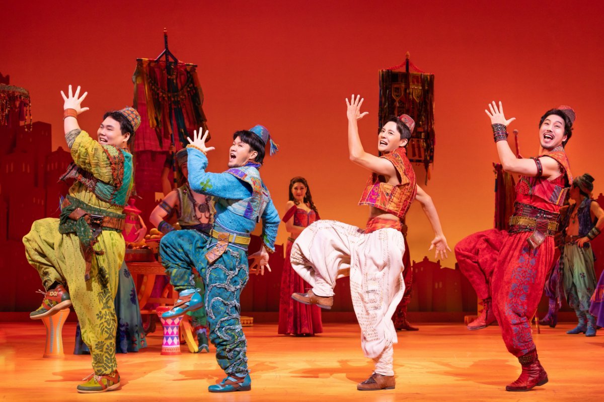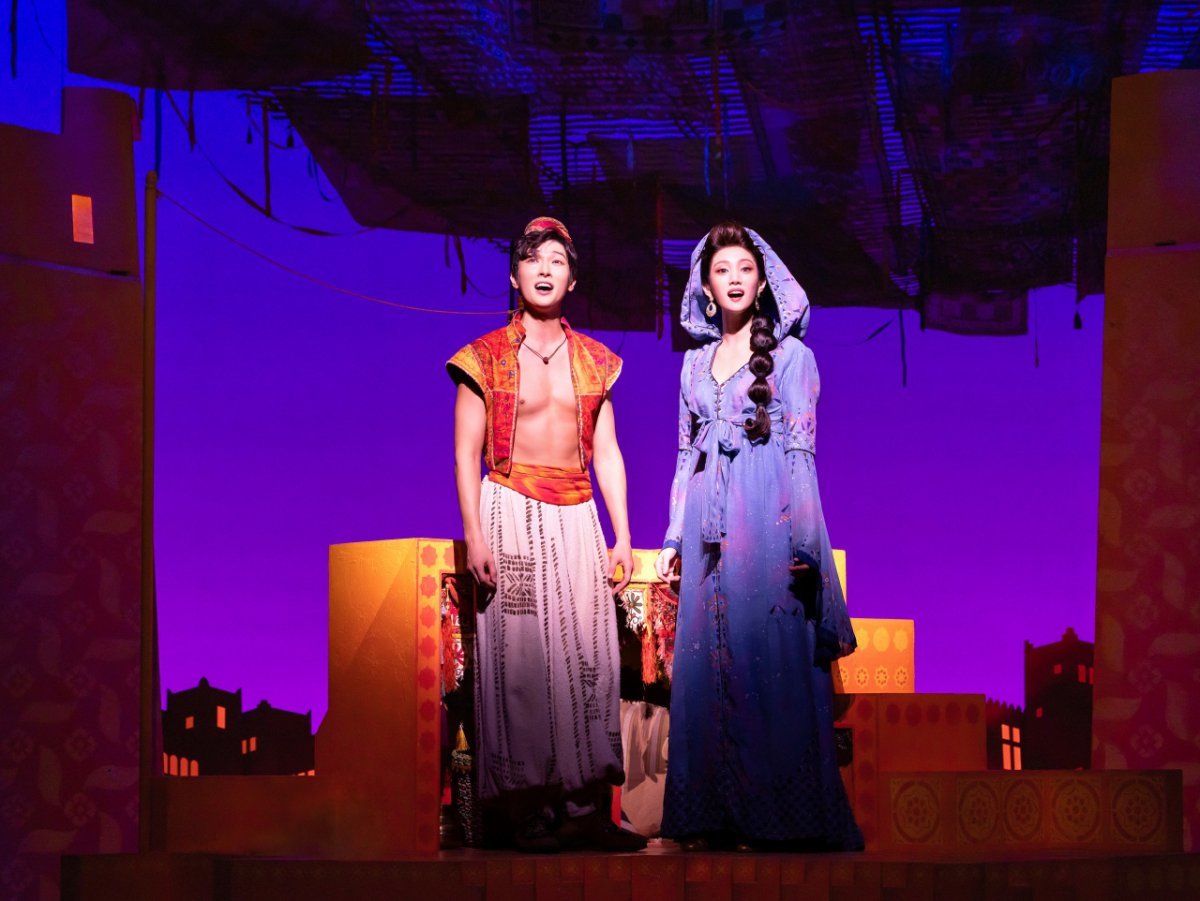 온통 황금색으로 번쩍이는 동굴, 램프 요정 지니의 손짓 하나하나에 순식간에 펼쳐지는 현란한 쇼에 탄성이 터져 나온다. 탭 댄스, 밸리 댄스, 스틱 댄스도 이어진다. 색색으로 가득한 입체 동화 같은 무대에 잠시도 눈을 뗄 수 없다. 알라딘과 자스민 공주가 마법 양탄자를 타고 밤하늘을 날며 ‘A Whole New World‘를 부르는 장면은 영리한 연출이 돋보인다. 무대 바깥 벽면까지 별빛 조명을 쏘아 시야를 확장시키고 알라딘과 자스민만 드러나게 한 것. 양탄자는 보이지 않게 처리함으로써 자연스럽게 몰입도를 높였다.