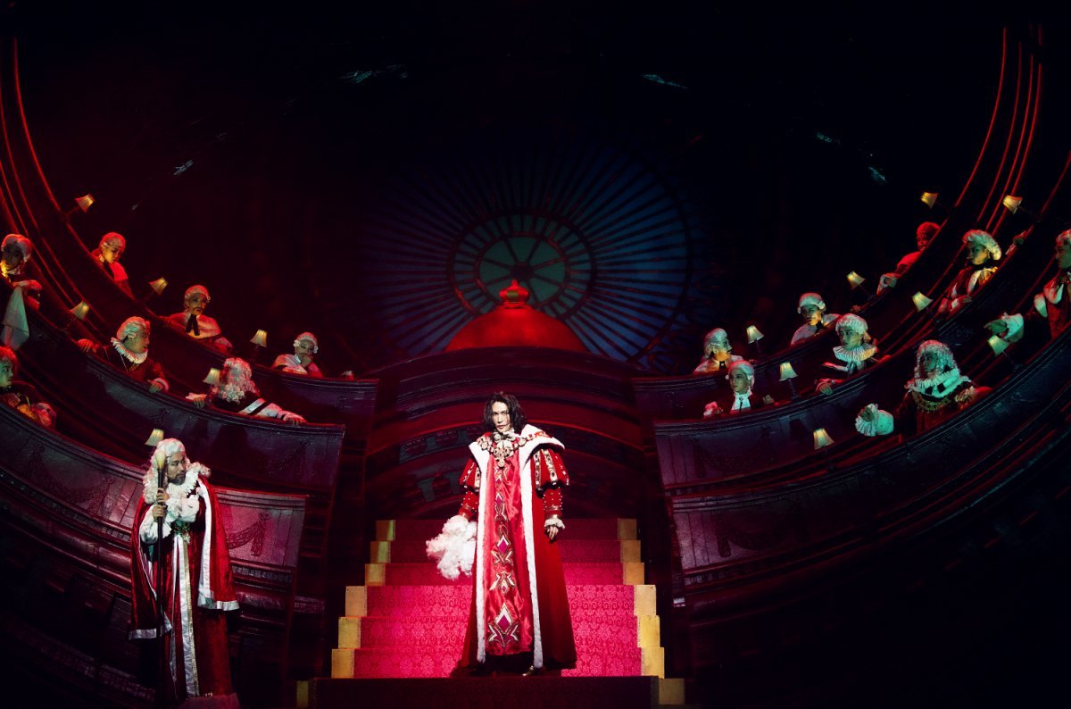 뮤지컬 ‘웃는 남자’에서 그윈플렌(가운데)은 상원 의회에서 제발 가난한 이들을 보라며 호소한다. EMK뮤지컬컴퍼니 제공