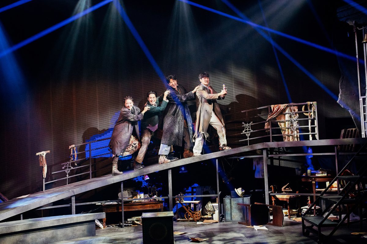 뮤지컬 ‘시지프스’에서 네 배우들이 ‘이방인’을 공연하고 있다. 과수원뮤지컬컴퍼니 제공