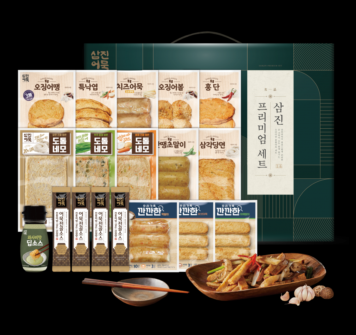 삼진프리미엄세트 1호(약 2.3㎏)는 당면 진짜 많은 도톰네모, 야채 진짜 많은 도톰네모, 부추잡채 넣은 도톰네모, 핫땡초말이, 깐깐한떡말이어묵, 깐깐한버섯어묵, 깐깐한야채말이어묵, 오징어볼, 삼각당면, 탱글한 치즈어묵 고소한맛, 홍단, 특낙엽, 오징어땡소로 구성했다. 삼진프리미엄세트 2호(약 2.7㎏)는 당면 진짜 많은 도톰네모, 야채 진짜 많은 도톰네모, 부추잡채 넣은 도톰네모, 핫땡초말이, 우리가족 깐깐한 떡말이 어묵, 우리가족 깐깐한 버섯 어묵, 우리가족 깐깐한 야채말이 어묵, 오징어볼, 삼각당면, 탱글한 치즈 어묵 고소한맛, 홍단, 특낙엽, 오징어땡소, 통새우말이, 순살바(야채, 매운, 오징어)로 구성했다. 두 세트 모두 와사비 맛 딥소스, 어묵전골 소스가 함께 들어 있어 별도의 재료 없이 간단하게 조리가 가능하다.