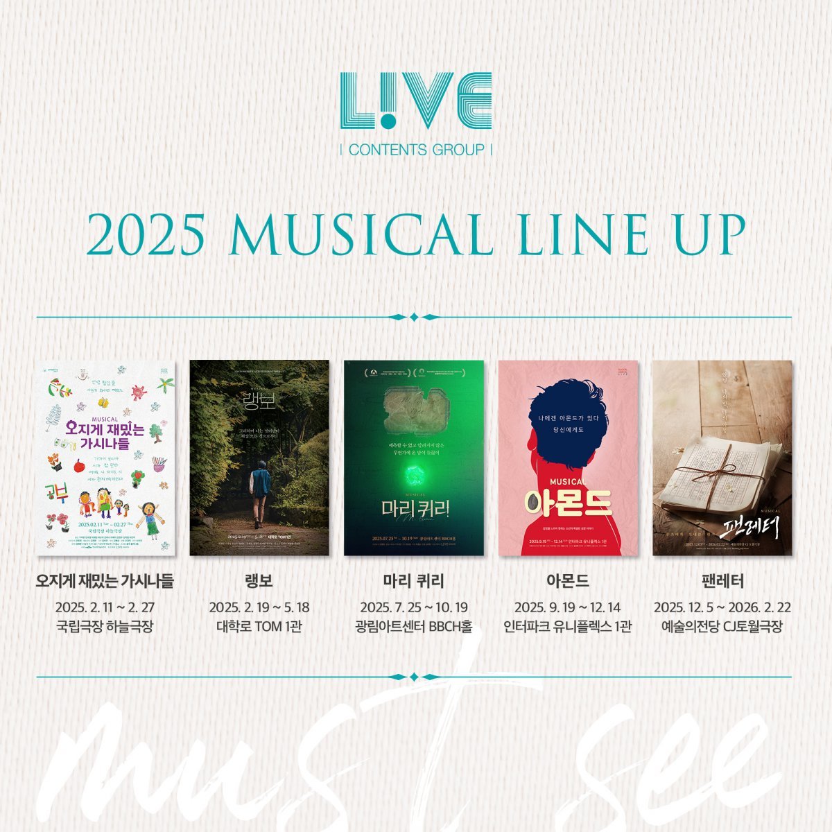 2025 뮤지컬 라인업. 라이브 제공강병원 라이브 대표는 “올해는 라이브가 제작한 한국 창작 뮤지컬의 글로벌 경쟁력을 강화하는 한 해가 될 것”이라며 “단순히 좋은 작품을 제작하는 것을 넘어, 한국적 감성을 세계적인 무대 언어로 전환하는 과정에 집중하겠다”고 전했다.