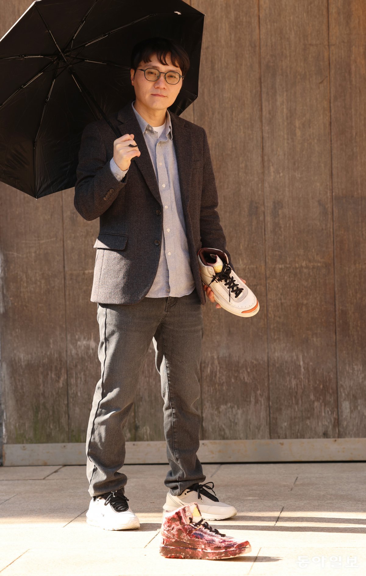 연극 ‘굿모닝 홍콩’의 최원종 연출가가 극에서 중요한 소품으로 등장하는 나이키 신발을 들고 서 있다. 이 신발은 3월 공연부터 새로 산 ‘진짜’ 나이키 에어조던 2로 교체될 예정이다. 변영욱 기자 cut@donga.com장사모 회원과 시위대, 경찰까지 등장인물만 20명에 이르는 연극 ‘굿모닝 홍콩’은 극단 명작옥수수밭이 ‘영혼까지 끌어모아’ 무대에 올린 작품이다. 배역이 많다 보니 배우들은 1인 다역을 하고, 스태프들까지 극단 전원이 출연해야 한다. 여러모로 난도가 높은 작품이지만 지난해 국립정동극장의 ‘창작ing’ 지원 사업 선정작에 뽑히며 올해도 다음 달 3일부터 국립정동극장 세실에서 공연된다. 어렵사리 무대를 이어 가는 최원종 연출가는 20일 ‘굿모닝 홍콩’을 “잃어버린 낭만에 대한 이야기”라고 소개했다.
