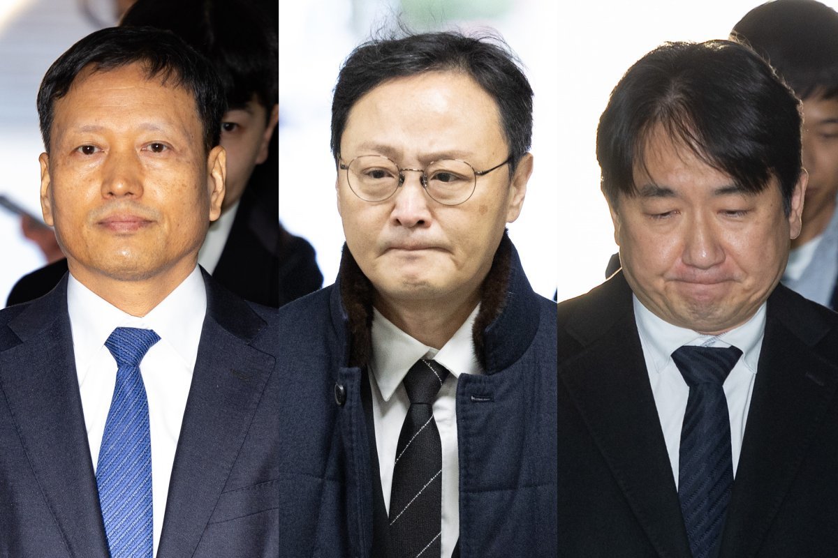 티메프 대규모 미정산 사태를 초래한 혐의를 받는 구영배(왼쪽부터) 큐텐그룹 대표와 류광진 티몬 대표, 류화현 위메프 대표가 18일 서울 서초구 서울중앙지방법원에서 열린 구속 전 피의자 심문(영장실질심사)에 출석하고 있다. 2024.11.18. [서울=뉴시스]