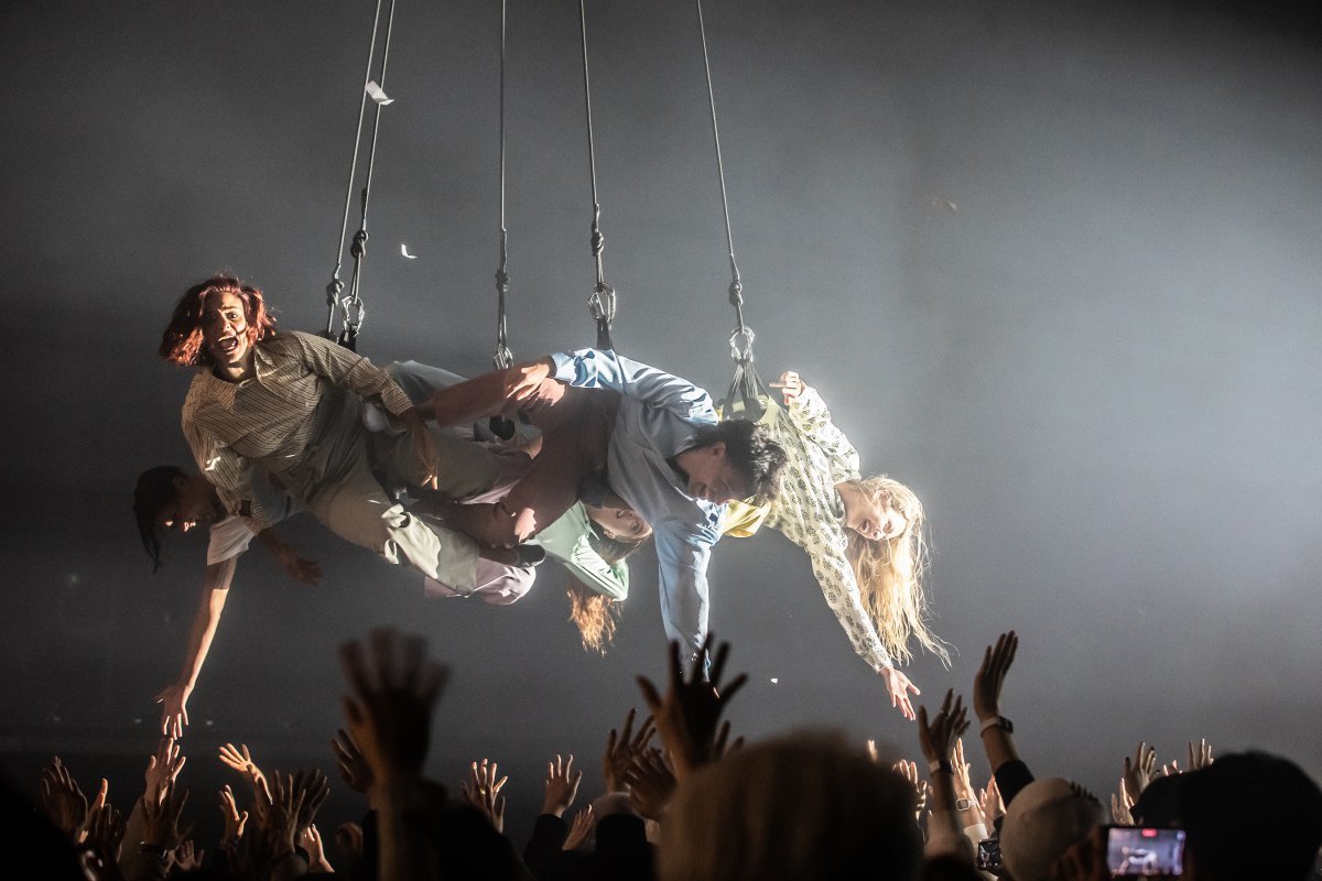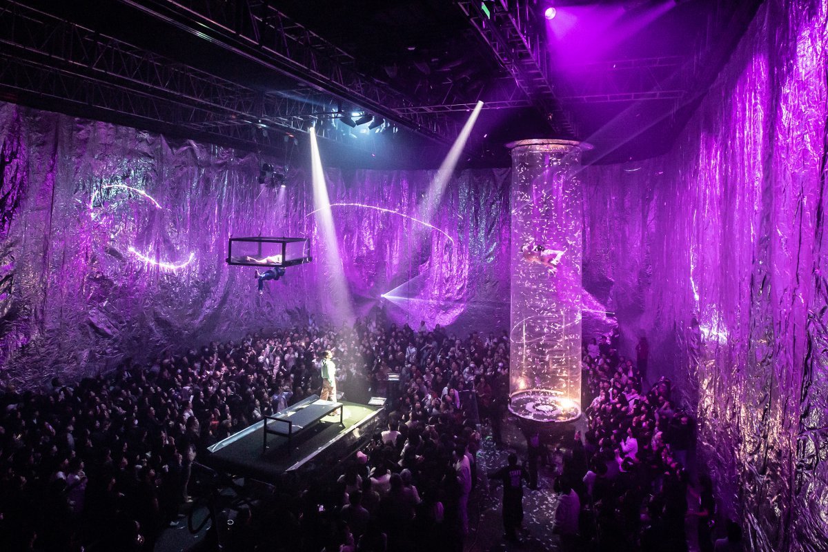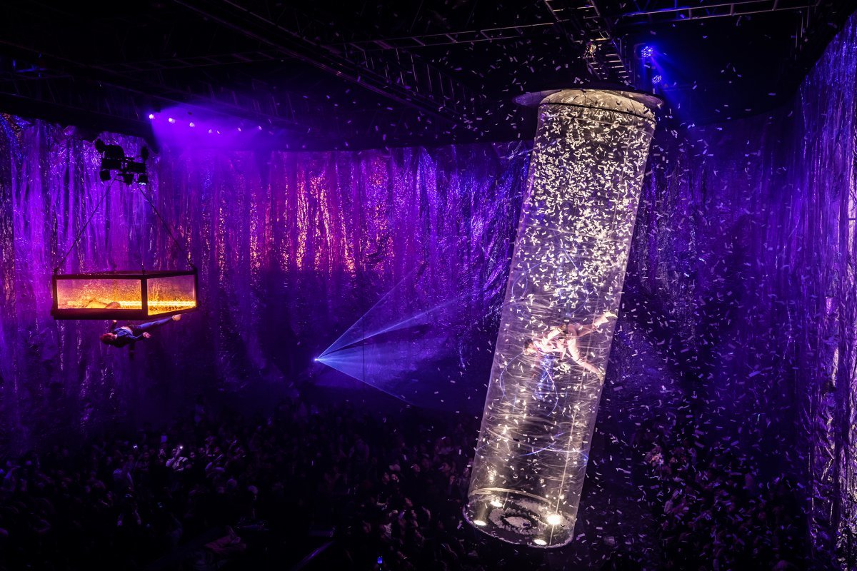 18일 서울 성동구 성수문화예술마당 FB씨어터에서 열린 이머시브형(관객참여형) 공연 ‘푸에르자 부르타(FUERZA BRUTA)’의 새 시리즈 ‘아벤(Aven)’의 한 장면. 공중에 뜬 고래 등 ‘자연’에서 영감을 받은 장치들을 활용했다. 크레센트엔터테인먼트 제공