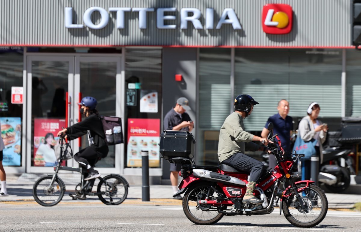 23일 서울 시내의 한 롯데리아 앞에서 배달기사들이 이동하고 있다. 2024.09.23 뉴시스버거 제품 가격이 일제히 오르는 ‘버거플레이션(버거+인플레이션)’이 현실화되는 모양새다. 저가 버거의 대표주자인 롯데리아의 ‘불고기 버거(리아 불고기)’도 이젠 단품 5000원대로 올라섰다.