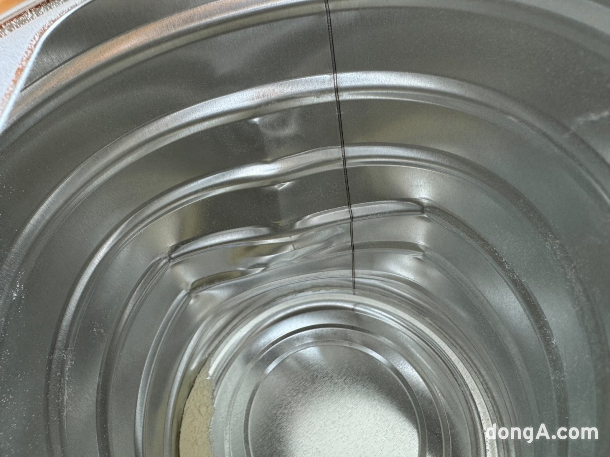 24일 본보가 입수한 일동후디스 특가 분유 안쪽이 찌그러져 캔 내부가 손상됐다.“스크래치나 찍힘 자국이 있을 수 있으나 내용물에는 문제 없으므로 안심하고 섭취하셔도 됩니다.”