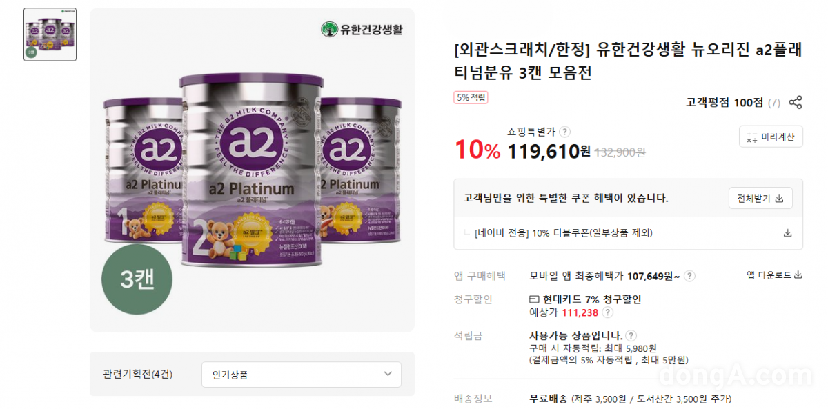 가격은 뉴오리진 a2플래티넘분유 3캔에 11만9610원으로 매겨졌다. 소비자가(13만2900원)보다 10% 저렴한 가격대다.