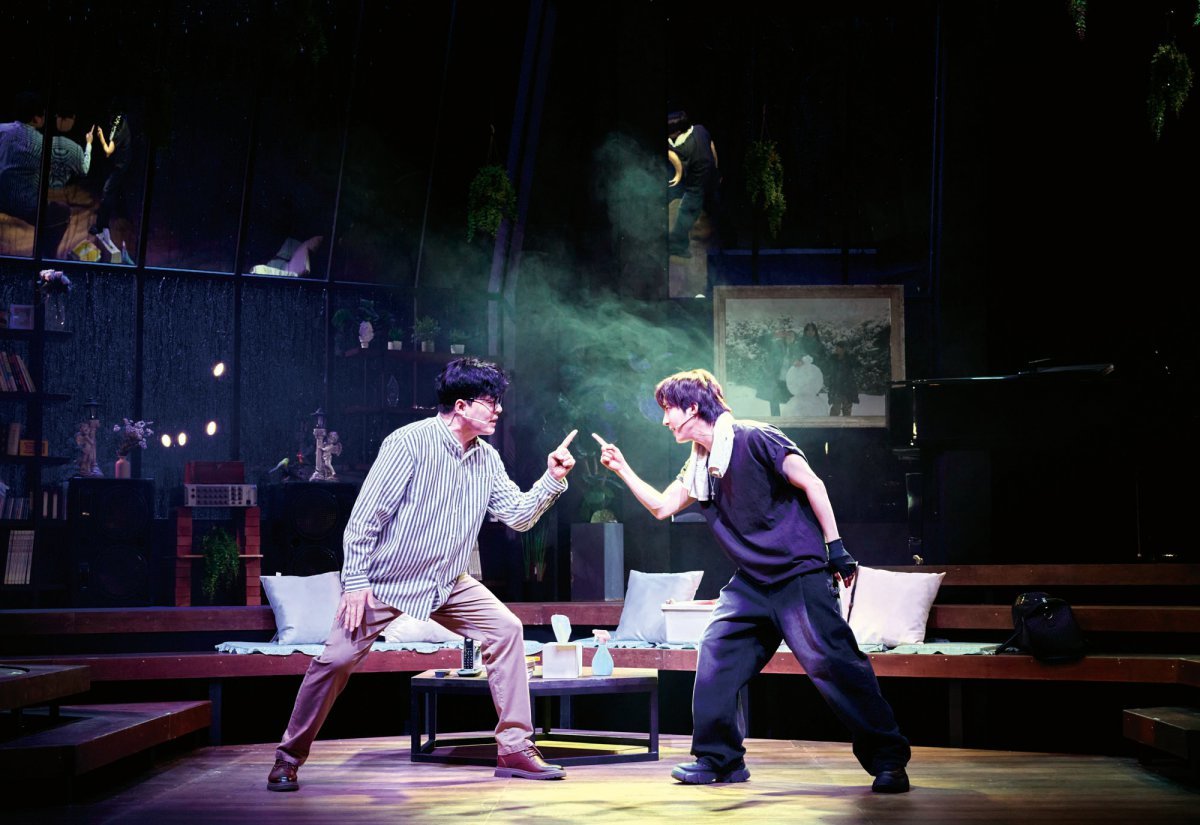 뮤지컬 ‘사랑은 비를 타고’에서 동욱(김형묵·왼쪽)과 동현(후이)이 마주섰다. 보더리스컴퍼니 제공 부모님이 세상을 떠난 후 동생들을 뒷바라지해 온 사남매의 맏이 동욱. 음악 교사인 동욱은 결혼한 여동생들의 살림까지 꼼꼼하게 챙긴다. 뛰어난 피아노 연주 실력으로 기대를 한 몸에 받았지만 어느 날 집을 떠난 막내 동현이 동욱의 생일날 7년 만에 불쑥 찾아온다.
