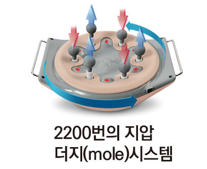 2200번의 지압 더지(mole) 시스템대체로 몸이 약한 사람은 복부(배)가 차다. 이는 장운동이 원활하지 않고 혈액순환이 원만하지 않아 생기는 현상이다. 인위적으로라도 배를 따뜻하게 해주고 장을 마사지해 장운동을 원활하게 해주면 장 때문에 발생하는 몸의 불균형을 바로잡을 수 있다.