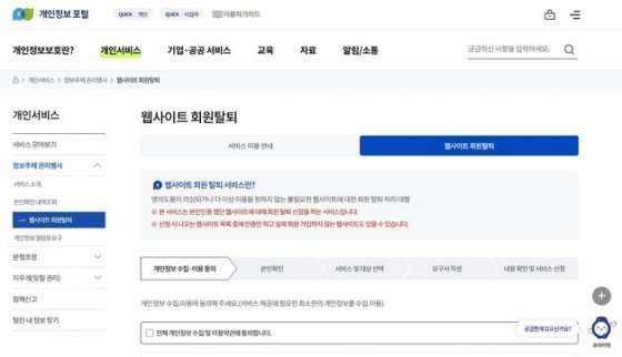 개인정보포털 ‘웹사이트 회원탈퇴’ 서비스 화면 갈무리. ⓒ News11일 소셜네트워크서비스(SNS) 등에서는 개인정보보호위원회가 운영하는 ‘개인정보 포털’ 링크가 꿀팁으로 공유되고 있다.