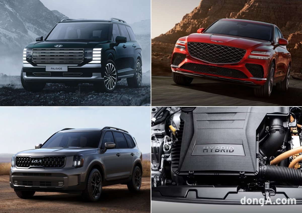 현대차 신형 팰리세이드. 현대차가 6일 신형 팰리세이드 외관 디자인 이미지를 처음 공개했다.이런 가운데 현대차그룹이 북미 시장에서 적극적으로 하이브리드 모델 라인업을 확대하고 있는 것이다. 국내와 달리 미국 시장에서 현대차그룹은 플러그인 하이브리드 모델 판매도 병행하고 있다. 대중적인 다운사이징 하이브리드와 플러그인 하이브리드에 이어 고출력 2.5와 3.5 가솔린 터보 하이브리드를 투입해 전체 하이브리드 모델 라인업을 더욱 촘촘하게 구성하는 모습이다. 특히 현대차그룹은 내년부터 주요 모델에 대한 신차 사이클(미국 기준)에 진입하게 된다. 현대차 신형 팰리세이드와 제네시스 GV60 상품성 개선(전기차), 제네시스 GV70 하이브리드, G80 상품성 개선, 기아 전기차 EV3, EV4, PV5 등이 출시 예정인 것으로 알려졌다. 반면 폭스바겐과 도요타, 닛산, 혼다, 마즈다 등 경쟁 브랜드는 신차 계획이 없거나 많아야 2~3종에 불과하다. 일부 브랜드는 향후 몇 년간 하이브리드 모델 출시 계획이 전무한 상황이기도 하다. 하이브리드 엔진을 다양하게 가져가면서 신차 사이클에 진입하는 현대차그룹의 경쟁력이 더욱 부각되는 이유다.