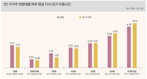 1인 가구 중에서도 연령대가 어릴수록 TV 이용 시간은 줄고 스마트폰 이용 시간은 늘어난 반면, 연령대가 높을수록 스마트폰 이용 시간보다 TV 이용 시간이 길었다. 20대 이하 1인 가구의 하루 평균 TV 이용 시간은 48분이었고, 70세 이상 1인 가구의 TV 이용 시간은 4시간 53분이었다.