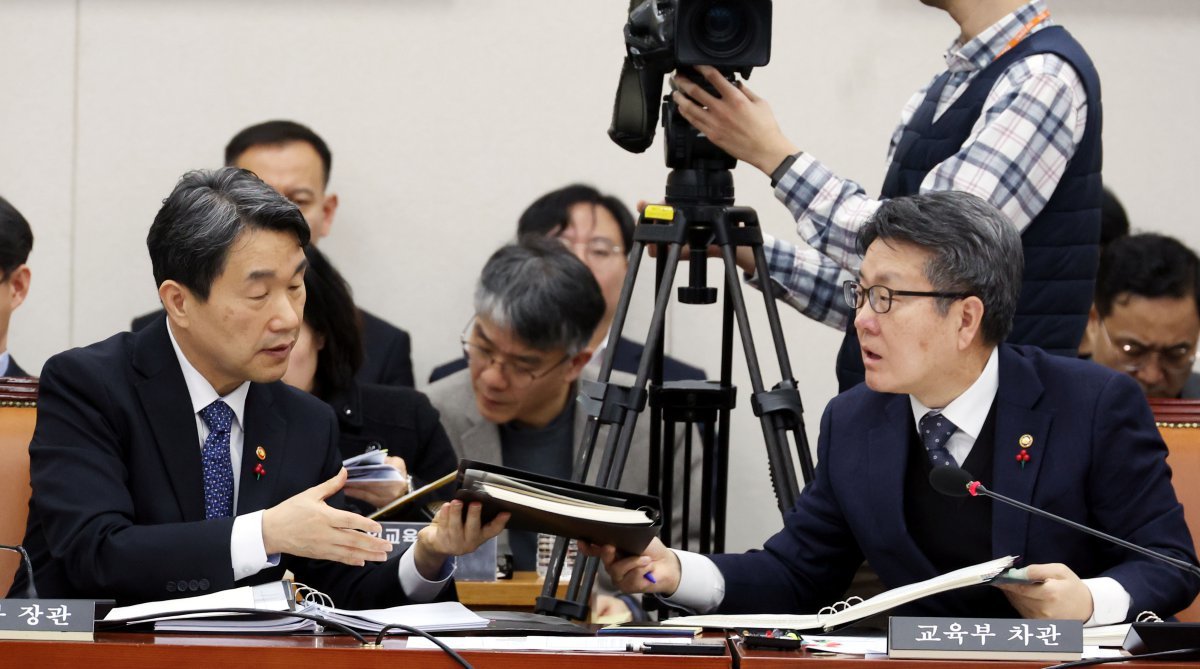 [서울=뉴시스] 조성봉 기자= 이주호 사회부총리 겸 교육부 장관이 17일 오전 서울 여의도 국회 교육위원회에서 열린 AI 디지털교과서 검증 청문회에서 오석환(오른쪽) 차관과 대화를 하고 있다. 2025.01.17. suncho21@newsis.com
