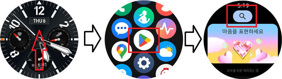 다만, 이런 특성 덕분에 LTE 버전 갤럭시워치는 스마트폰과 연동을 하지 않은 단독 운용 상황에서도 손쉽게 온라인 음악 스트리밍 서비스를 이용할 수 있습니다. 웨어OS에 탑재된 구글 플레이 스토어를 통해 ‘유튜브 뮤직’, ‘스포티파이’, ‘멜론’, ‘지니뮤직’ 등의 워치용 앱을 설치하면 되지요. 홈 화면을 위쪽으로 쓸어 올려 앱 목록을 표시한 뒤, 여기서 구글 플레이 스토어 앱을 실행합니다. 여기서 직접 검색어를 입력하거나 ‘음악/오디오’ 분류를 선택해 원하는 음악 서비스 앱을 갤럭시워치에 설치할 수 있죠.