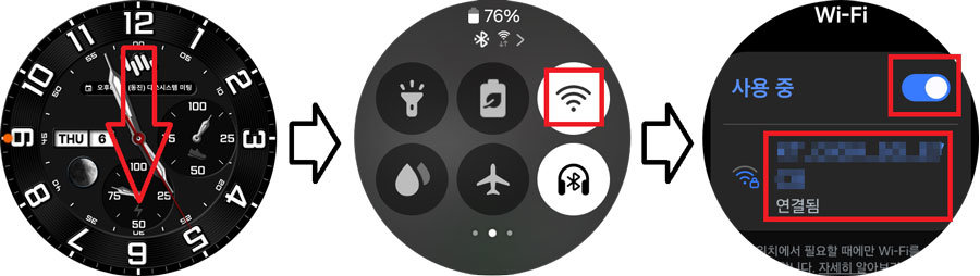 블루투스 이어폰이나 헤드폰이 있다면 이 역시 갤럭시워치에 무선 연결해 편하게 음악을 들을 수 있습니다. 홈 홈 화면에서 위쪽 부분을 손으로 쓸어 내리면 나타나는 와이파이 메뉴를 1초 이상 누른 후, ‘연결’→’블루투스’→’찾기’ 순으로 메뉴 이동하면 자신이 가진 블루투스 이어폰/헤드폰을 갤럭시워치에 연결해 음악감상을 할 수 있습니다.