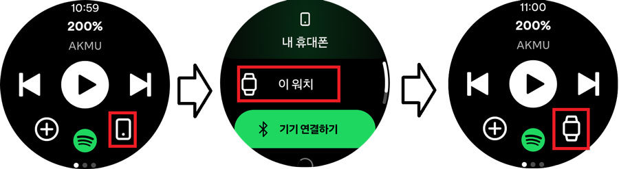 워치용 유튜브 뮤직이나 스포티파이 앱을 실행한 후, 로그인을 해야 합니다. 연동된 스마트폰에 유튜브 뮤직이나 스포티파이의 로그인이 되어 있다면 한층 편하게 워치에서도 로그인이 가능합니다. 그리고 재생 위치를 ‘스마트폰’이 아닌 ‘워치’로 설정해 주세요. 이렇게 해야 스마트폰이 아닌 갤럭시워치에서 음악을 재생합니다.
