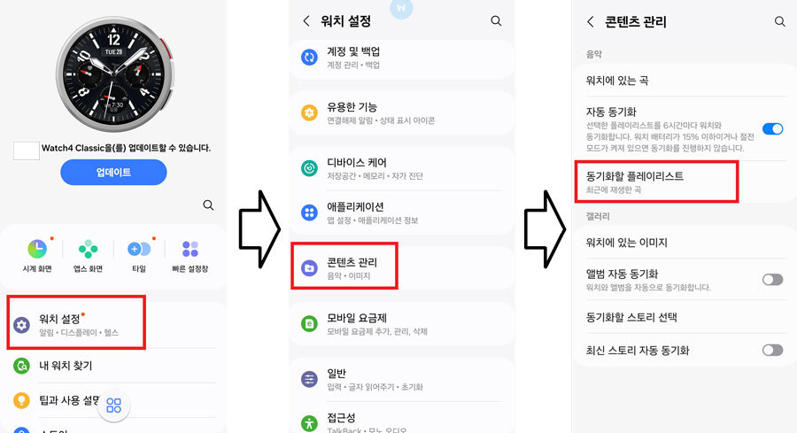 스마트폰에 저장된 음악파일을 갤럭시워치로 전송하는 방법 / 출처=IT동아스마트폰에 설치된 웨어러블 기기 관리 앱인 ‘갤럭시 웨어러블(Galaxy Wearable)’을 실행, ‘워치 설정’→’콘텐츠 관리’→’동기화할 플레이리스트’ 순으로 메뉴 이동하면 스마트폰에 저장된 음악 파일을 갤럭시워치로 동기화 형식으로 전송할 수 있습니다.