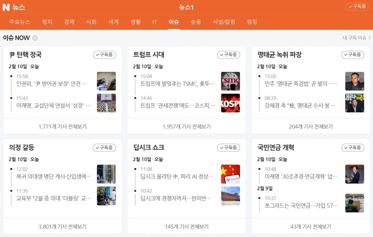 예를 들어 미국 정치에 관심이 많은 이용자는 ‘트럼프 취임식’이나 ‘트럼프 2기’ 등 이슈를 구독하고 언론사 편집판의 ‘이슈구독카드’, MY뉴스판의 ‘이슈NOW 카드’ 등에서 손쉽게 뉴스를 확인할 수 있다.