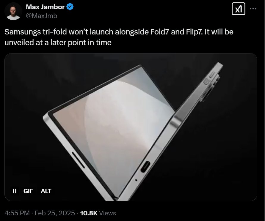 26일 업계에 따르면 IT 팁스터(정보 유출자) 맥스 잼버는 자신의 X(구 트위터)를 통해 “삼성전자의 트리폴드폰은 갤럭시 Z 폴드·플립7과 함께 출시되지 않을 것이다. 트리폴드폰은 다른 시기에 공개될 것”이라고 주장했다.