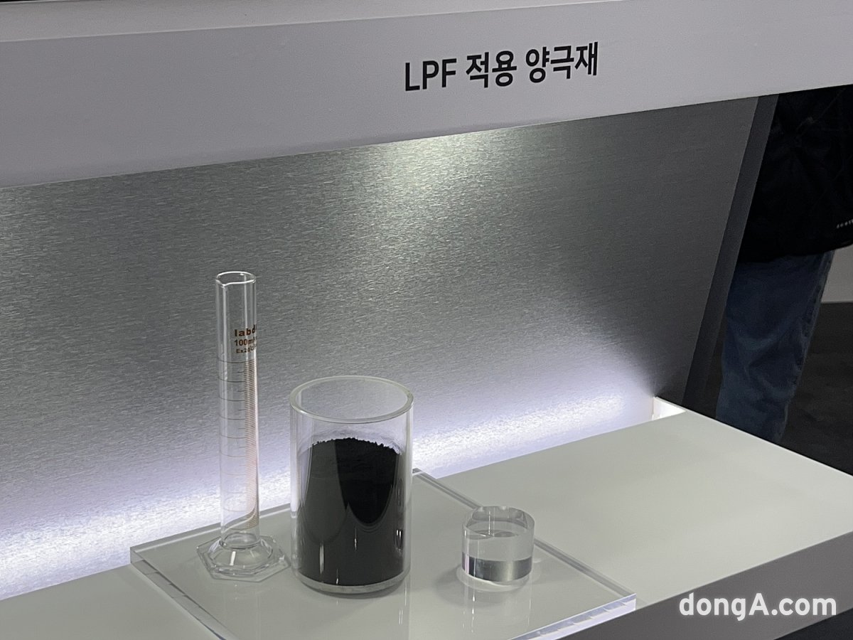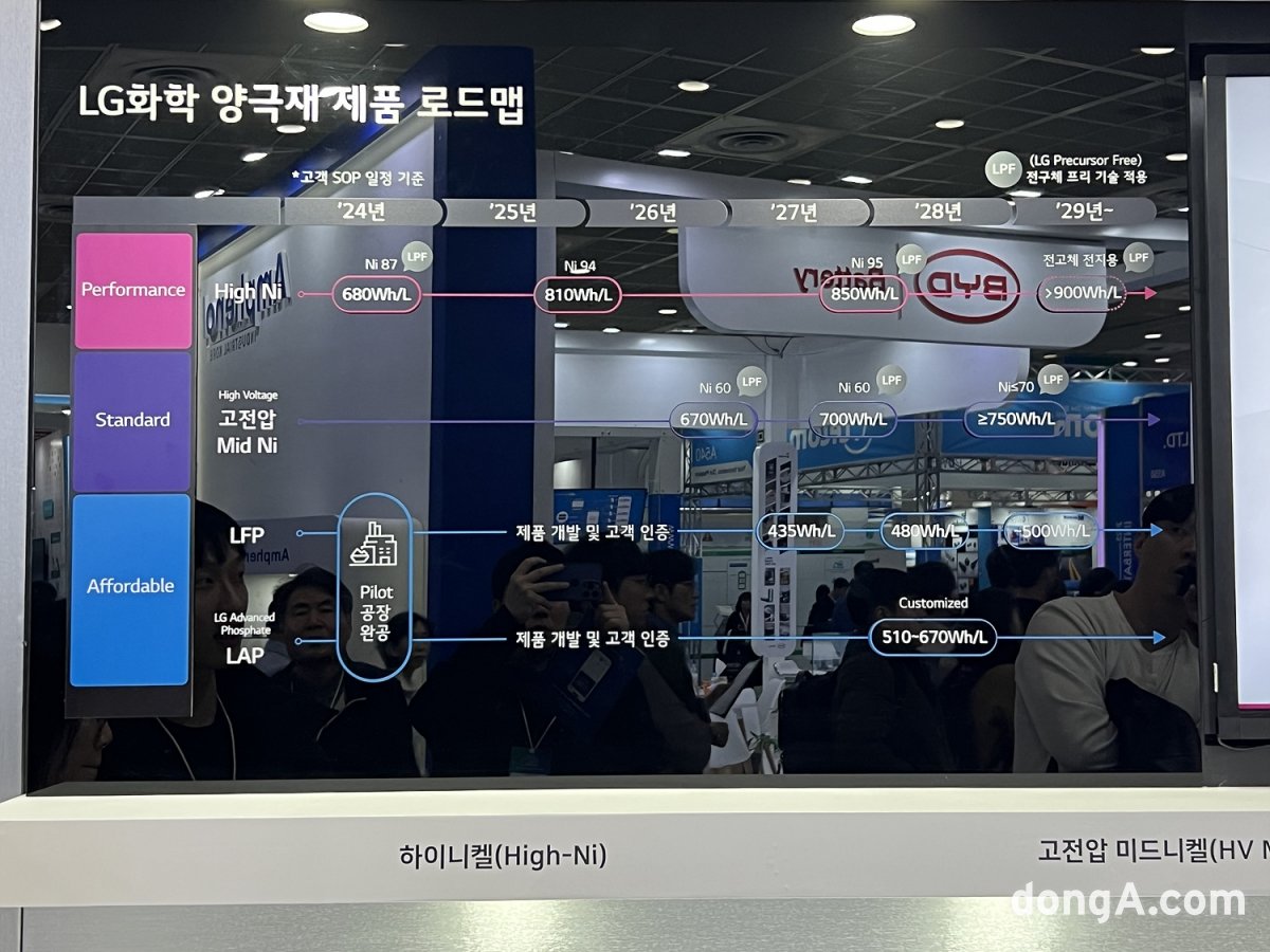 LG화학 양극재 제품 로드맵이번 인터배터리에서 LG화학은 ‘Sustainable Future, Powered by LG Chem’이라는 주제를 내걸고 신규 LPF양극재 기술과 함께 기존 주력 제품인 하이니켈 양극재를 비롯해 미드니켈(Mid Mi) 제품과 고밀도 LFP, NCM과 블렌딩한 LFP 제품군 등을 전시했다. 건식전극용 양극재와 전고체용 양극재 등 차세대 혁신 소재도 대거 선보였다.