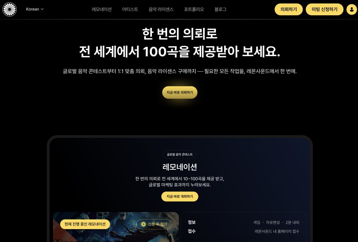 레몬사운드 진행 방식(자료 출처- 게임동아)”저는 한예종 작곡과 출신이에요. 학교를 다니던 시절에, 시장의 문제점을 발견했죠. 게임이나 영화 등 음악이 필요한 친구들이 많은데 다 네이버에서 검색하고 있더라고요. 음악이 필요한 사람과, 음악을 한국에서 제일 잘하는 사람들이 한 건물 안에 있는데 말이에요. 각 전공 학생들이 서로 연결이 안되고 있구나 싶어서, 테스트 겸 매칭 홈페이지를 만들었더니 돈을 잘 벌게 되더라고요. 그래서 바로 창업을 했죠.“