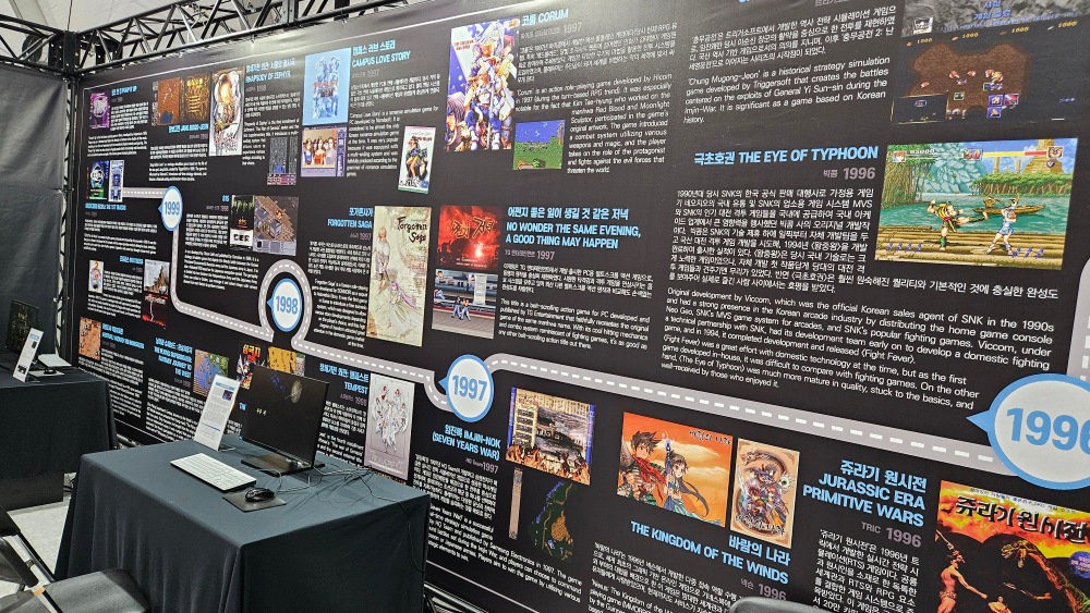한국 PC게임의 역사에 빠질 수 없는 대표 게임 20종의 패키지 전시(사진 출처-게임동아)또 K-게임 주최 측에서는 벽면에 1980년대부터 현재까지 한국에서 유통되거나 개발된 게임들을 일대기로 꾸며놓아 역사관의 가치를 높였으며, 현대 컴보이 용으로 출시된 ‘코코 어드벤쳐’, 삼성 슈퍼 알라딘보이 용으로 출시된 ‘우주 거북선’을 직접 플레이할 수 있도록 시연대를 마련했다.