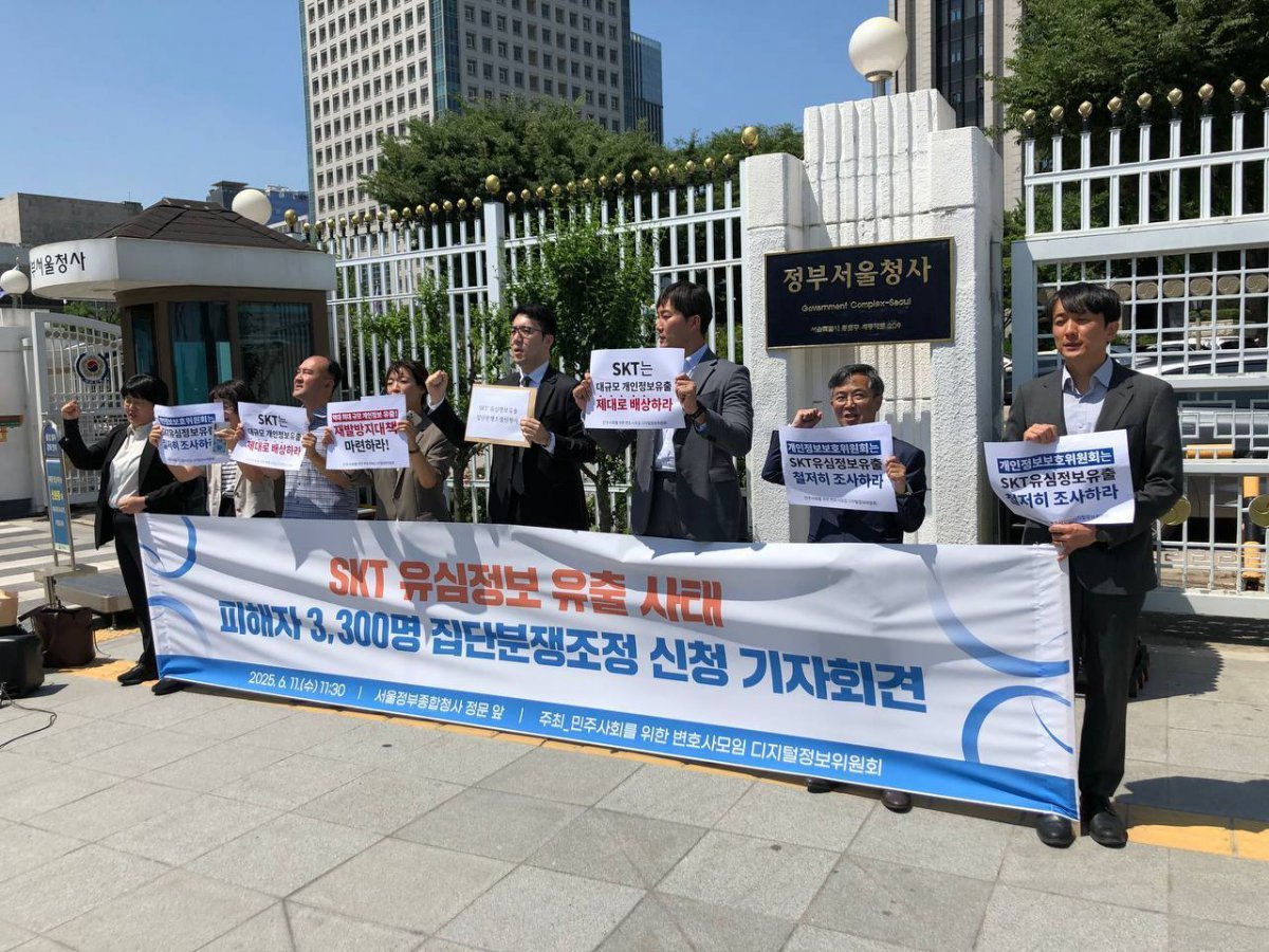 민주사회를위한변호사모임(민변) 디지털정보위원회가 11일 오전 정부서울청사 앞에서 기자회견을 하고 있다. (민변 제공)SK텔레콤(SKT) 유심 유출 사태 피해자들이 개인정보보호위원회와 소비자단체에 분쟁조정을 신청했다.