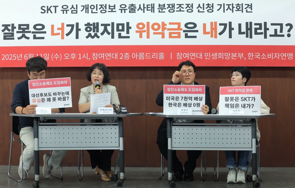 11일 오후 서울 종로구 통의동 참여연대 아름드리홀에서 열린 SKT 유심 개인정보 유출 사태 분쟁조정 신청 기자회견에서 피해당사자인 SKT알뜰폰 이용자가 발언하고 있다. 2025.6.11/뉴스1앞서 민간합동조사단과 개인정보위 조사 결과 SKT 유심 유출사건은 3년 전인 2022년 6월 15일 악성코드가 침입하면서 발생했다.