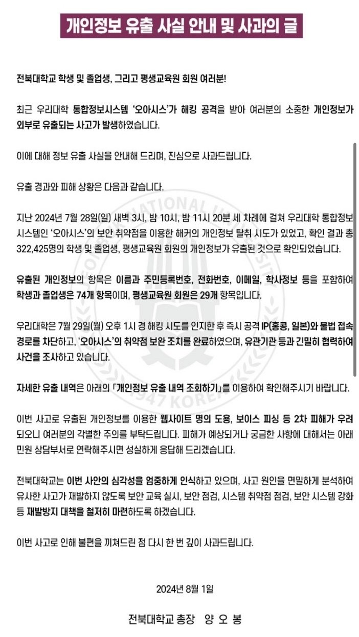 전북대학교 통합정보시스템 해킹 사건과 관련해 대학 홈페이지에 게시된 사과 안내문