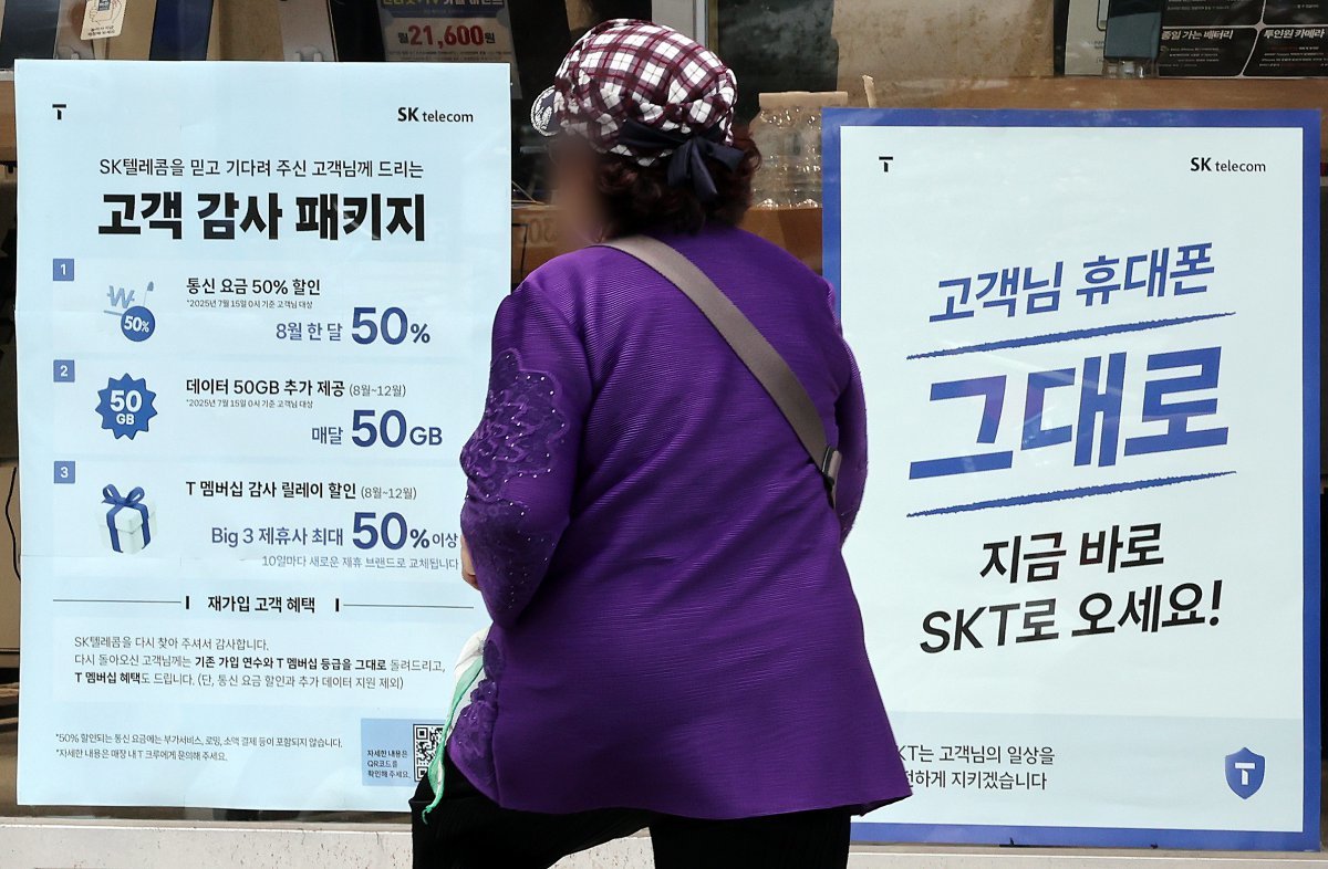 SK텔레콤이 사이버 침해 사고 이후 번호 이동하는 가입자에 대한 위약금 면제를 결정한 가운데 7일 서울의 한 SKT 공식매장에 ‘고객 감사 패키지’ 안내가 붙어 있다. 2025.7.7/뉴스1 SK텔레콤이 유심 해킹 사태 후속 조치로 위약금 면제를 발표한 후 나흘간 약 4만 1858명이 통신사를 옮긴 것으로 나타났다. SK텔레콤 가입자 순감 규모는 1만 6851명 수준이다.