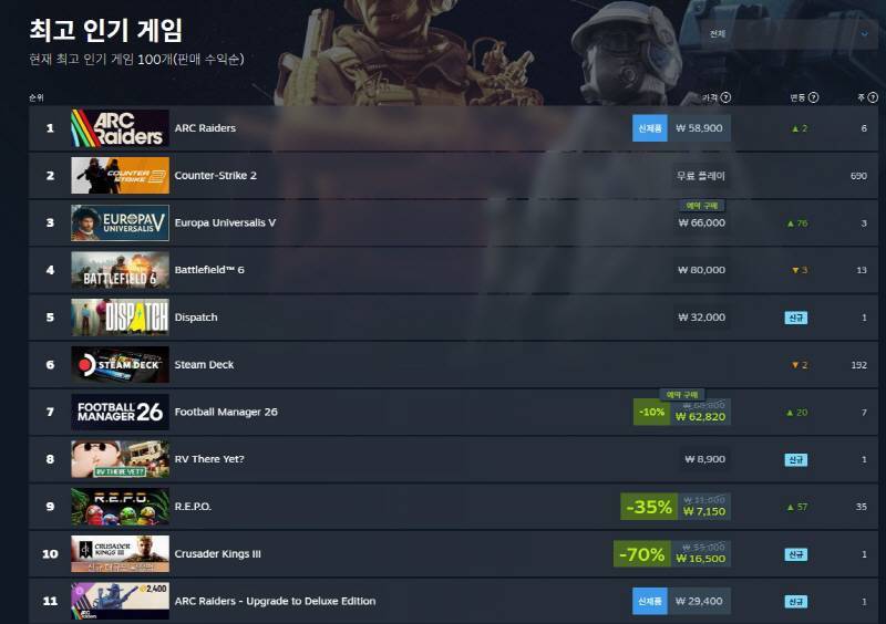 스팀 글로벌 최고 판매 1위(4일 기준)(자료 출처-게임동아)이후 엄청난 상승세를 기록한 ‘아크 레이더스’는 전 플랫폼 최고 동시접속자수 70만 명을 달성하며 출시 첫 주 기록을 자체 경신했으며, 11일 만에 400만 장을 판매하며 글로벌 밀리언셀러 반열에 오르는 기염을 토했다.