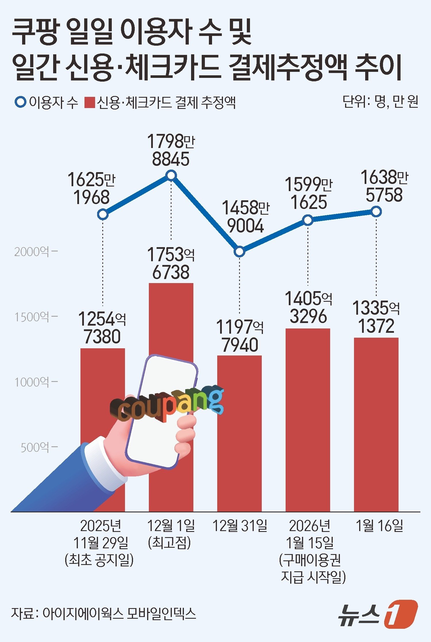특히 16일엔 1638만 5758명으로, 지난해 12월 7일(1610만 3500명) 이후 40일 만에 1600만 명대를 회복했다. 쿠팡 사태 최초 공지일(지난해 11월 29일 1625만 1968명)보다 높은 수치다.