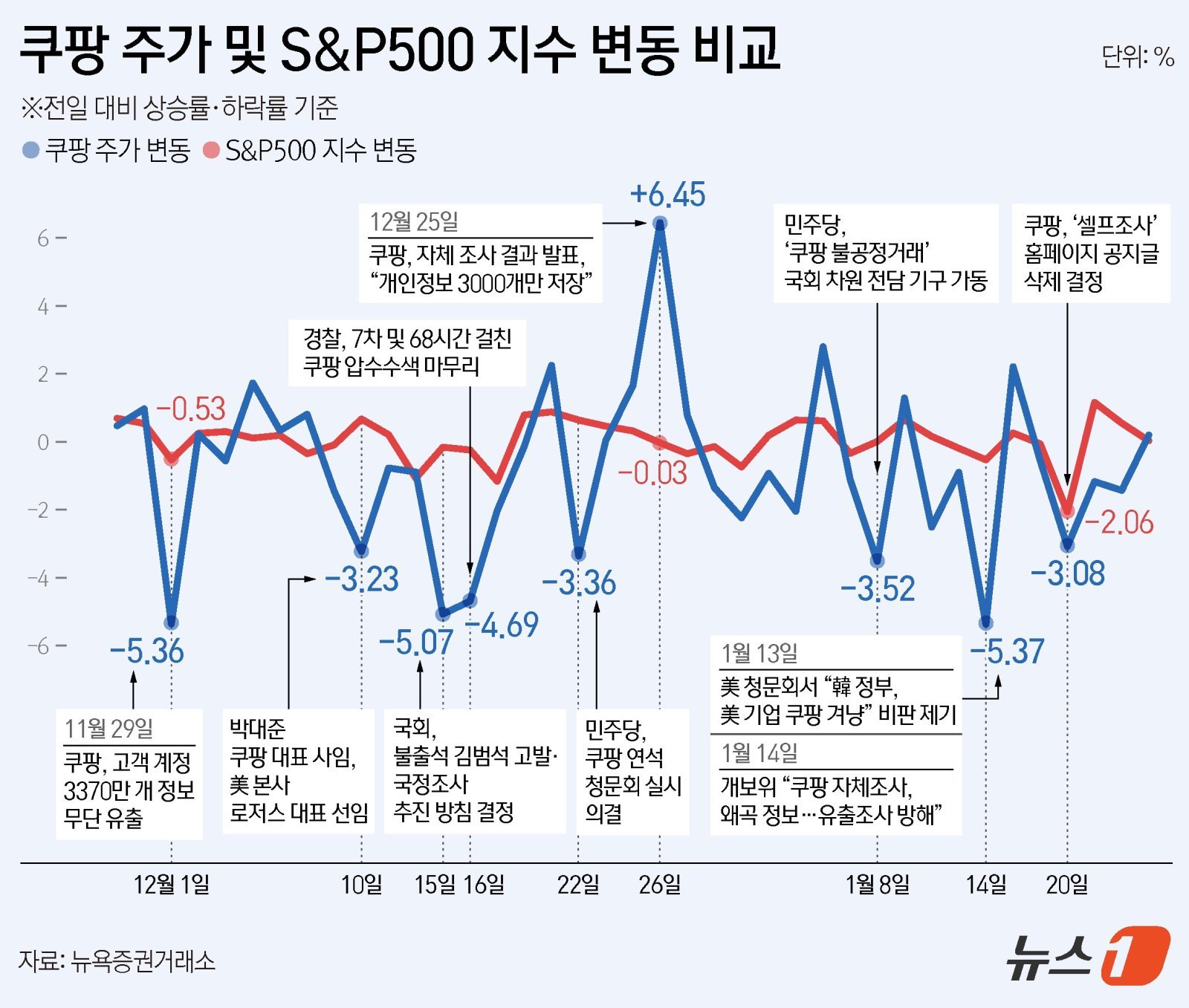 뉴스1실제로 국회가 김범석 의장 고발과 국정조사 추진을 결정한 지난해 12월 15일 미국 뉴욕증권거래소에서 쿠팡 주가는 5.07% 하락했고, 더불어민주당이 쿠팡 연석 청문회를 의결한 12월 22일에도 3.36% 하락했다. 쿠팡이 자체 조사결과를 발표한 다음날인 12월 26일에는 6.45% 반등했지만, 미국 하원 청문회에서의 여론 악화와 개인정보보호위원회의 쿠팡 자체조사 내용 반박이 이어진 이후 1월 14일에는 5.37% 하락하기도 했다.